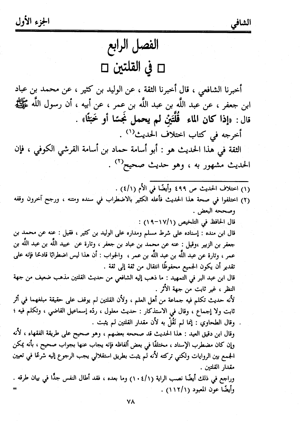 قال ابن عبد البر في التمهيد: ما ذهب إليه الشافعي من حديث القلتين مذهب ضعيف من جهة النظر، غير ثابت من جهة الأثر.