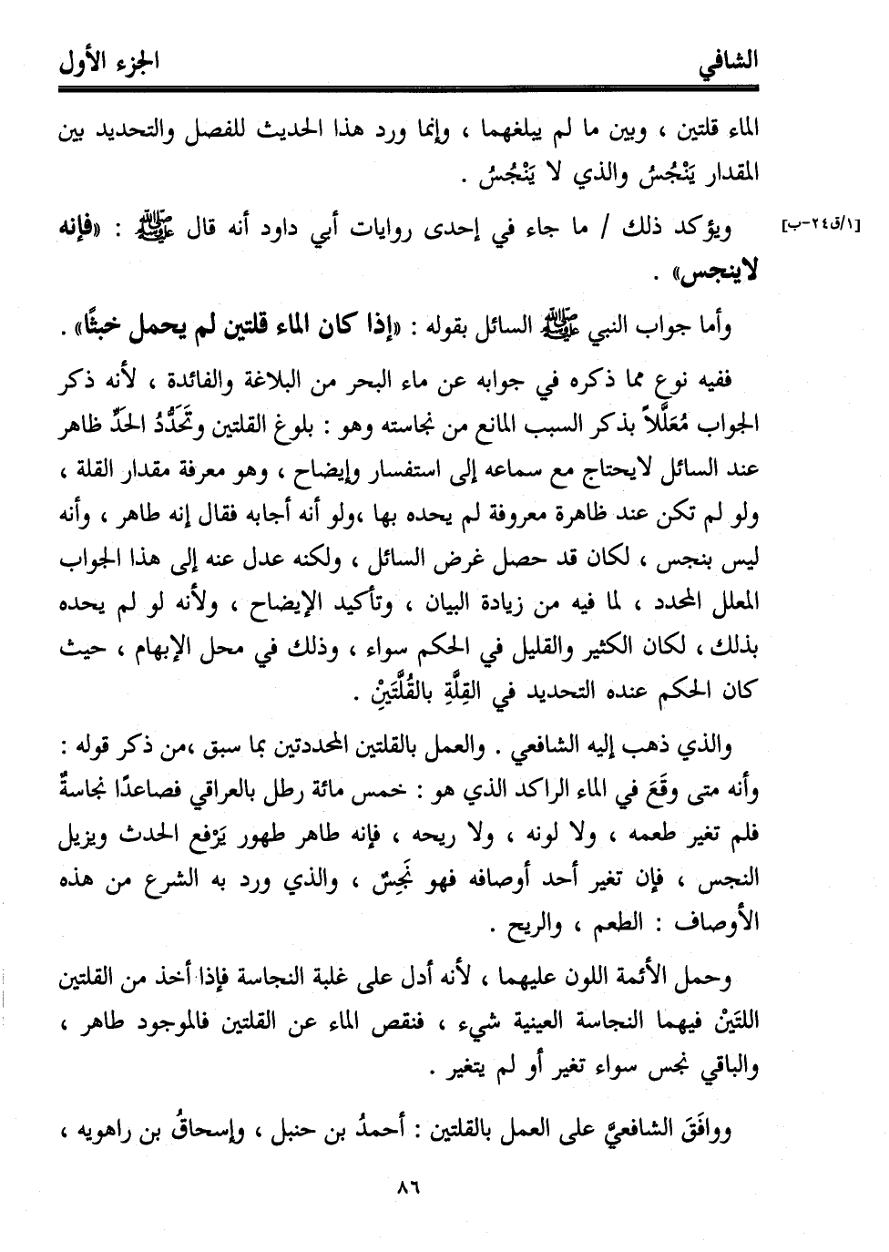 ففيه نوع مما ذكره في جوابه عن ماء البحر من البلاغة والفائدة, لأنه ذكر الجواب مُعَلَّلاً بذكر السبب المانع من نجاسته وهو: بلوغ القلتين وتَحَدُّدُ الحَدِّ ظاهر عند السائل لايحتاج مع سماعه إلى استفسار وإيضاح، وهو معرفة مقدار القلة، ولو لم تكن عند ظاهرة معروفة لم يحده بها, ولو أنه أجابه فقال إنه طاهر، وأنه ليس بنجس, لكان قد حصل غرض السائل، ولكنه عدل عنه إلى هذا الجواب المعلل المحدد، لما فيه من زيادة البيان، وتأكيد الإيضاح، ولأنه لو لم يحده بذلك، لكان الكثير والقليل في الحكم سواء، وذلك في محل الإبهام، حيث كان الحكم عنده التحديد في القِلَّةِ بالقُلَّتَيِنْ.