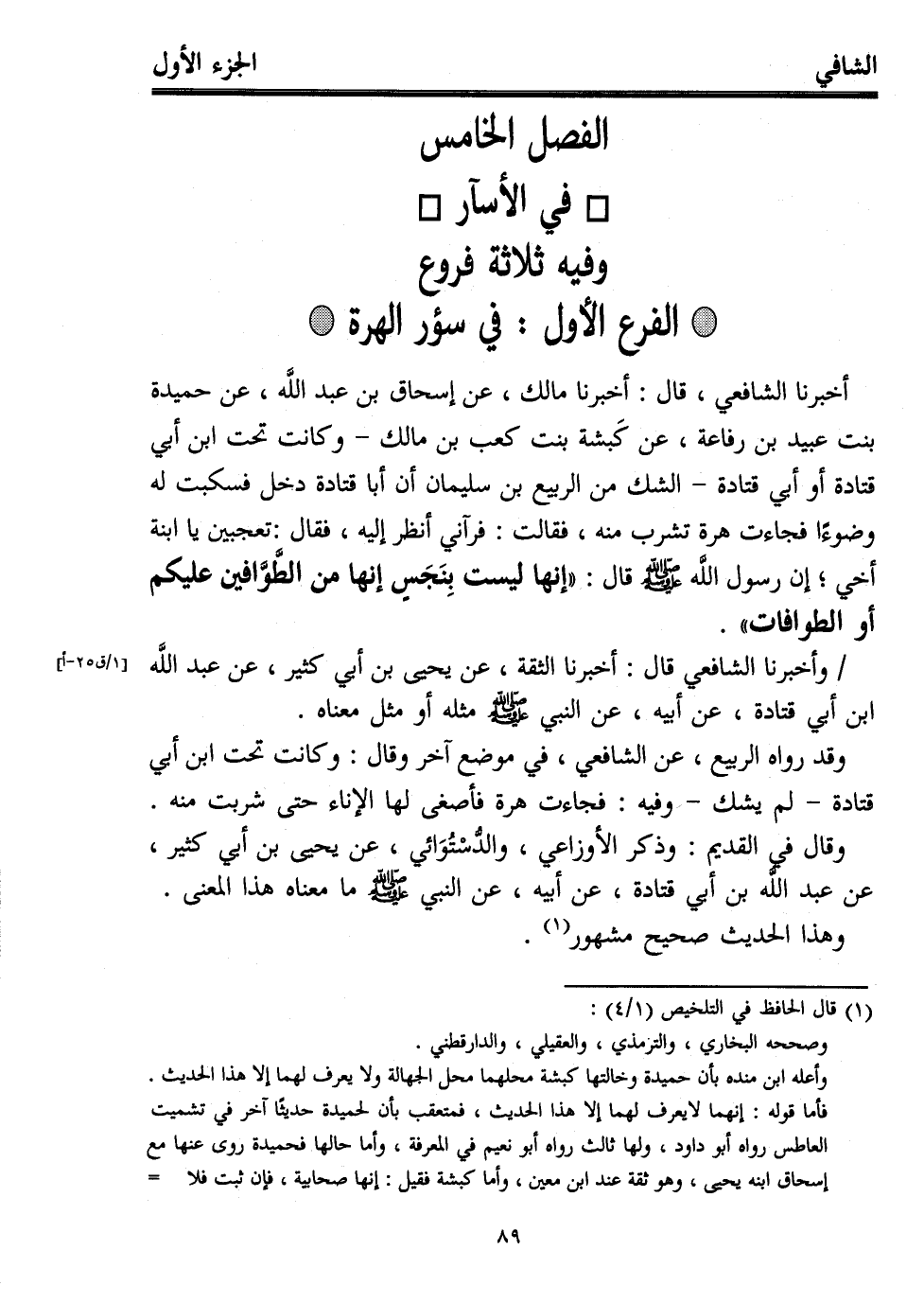 أخبرنا الشافعي، قال: أخبرنا مالك، عن إسحاق بن عبد اللَّه، عن حميدة بنت عبيد بن رفاعة، عن كَبشة بنت كعب بن مالك - وكانت تحت ابن أبي قتادة أو أبي قتادة- الشك من الربيع بن سليمان أن أبا قتادة دخل فسكبت له وضوءًا فجاءت هرة تشرب منه، فقالت: فرآني أنظر إليه، فقال: تعجبين يا ابنة أخي؛ إن رسول اللَّه - صلى الله عليه وسلم - قال: "إنها ليست بِنَجَسٍ إنها من الطَّوَّافين عليكم أو الطوافات".