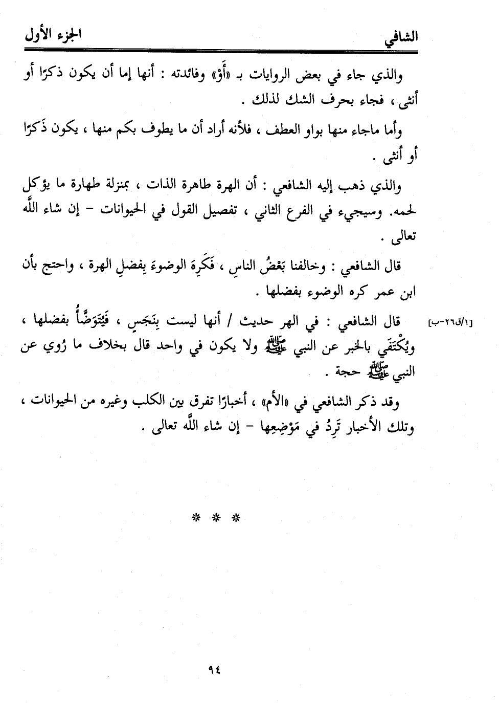 قال الشافعي: في الهر حديث أنها ليست بِنَجَسٍ، فَيُتَوَضَّأُ بفضلها، ويُكْتَفَي بالخبر عن النبي - صلى الله عليه وسلم - ولا يكون في واحد قال بخلاف ما رُوي عن النبي - صلى الله عليه وسلم - حجة.
