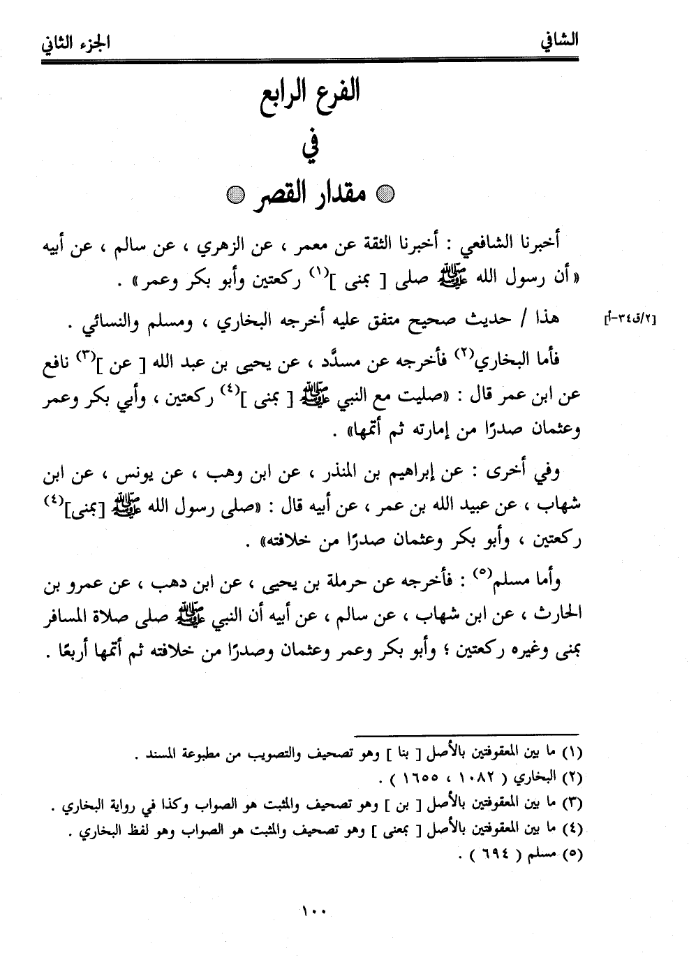 أخبرنا الشافعي: أخبرنا الثقة عن معمر، عن الزهري، عن سالم، عن أبيه "أن رسول الله - صلى الله عليه وسلم - صلى [بمنى] (¬1) ركعتين وأبو بكر وعمر".