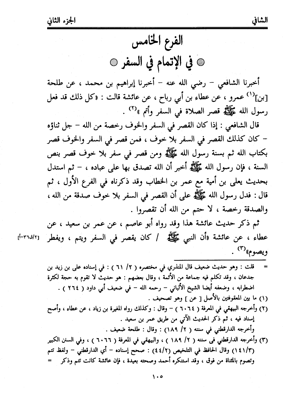 أخبرنا الشافعي -رضي الله عنه- أخبرنا إبراهيم بن محمد، عن طلحة [بن] (¬1) عمرو، عن عطاء بن أبي رباح، عن عائشة قالت: "كل ذلك قد فعل رسول الله - صلى الله عليه وسلم - قصر الصلاة في السفر وأتم" (¬2).