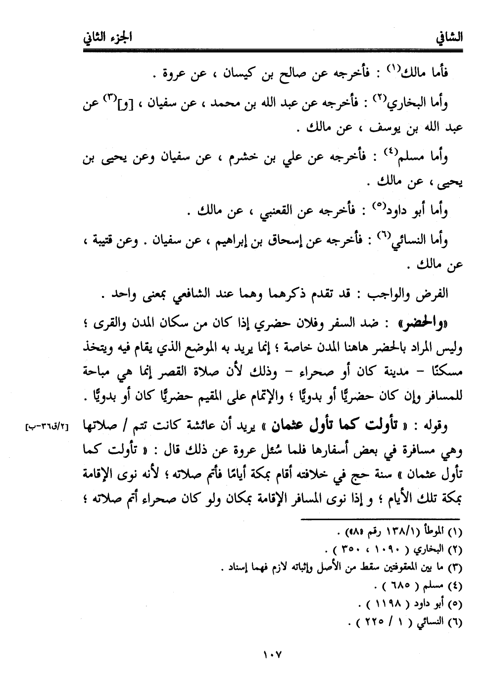 وقوله: "تأولت كما تأول عثمان" يريد أن عائشة كانت تتم صلاتها وهي مسافرة في بعض أسفارها فلما سُئل عروة عن ذلك قال: "تأولت كما تأول عثمان" سنة حج في خلافته أقام بمكة أيامًا فأتم صلاته؛ لأنه نوى الإقامة بمكة تلك الأيام؛ وإذا نوى المسافر الإقامة بمكان ولو كان صحراء أتم صلاته؛