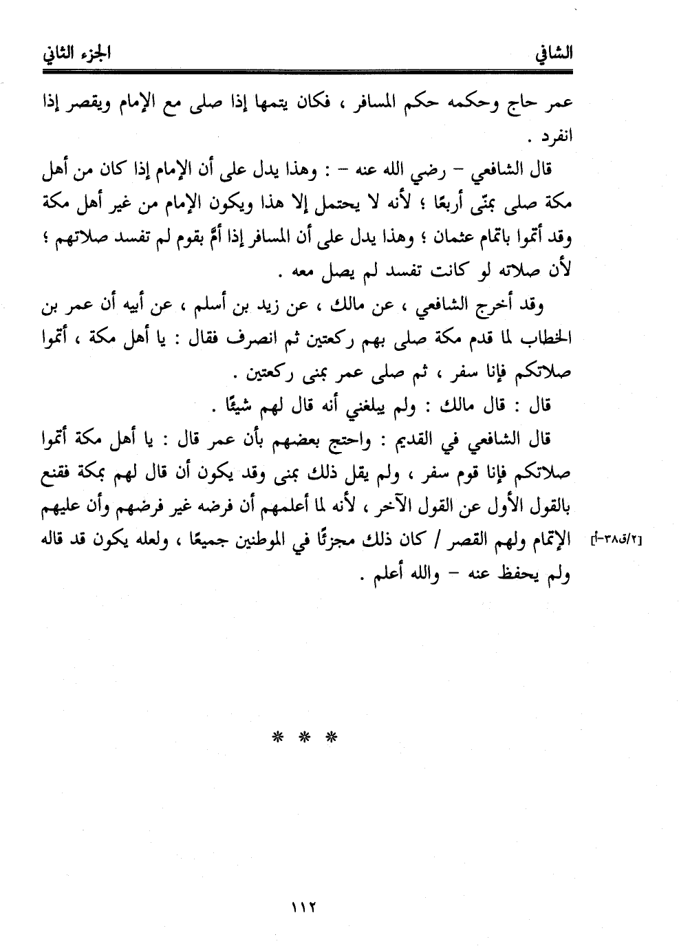وقد أخرج الشافعي، عن مالك، عن زيد بن أسلم، عن أبيه أن عمر بن الخطاب لما قدم مكة صلى بهم ركعتين ثم انصرف فقال: يا أهل مكة، أتموا صلاتكم فإنا سفر، ثم صلى عمر بمنى ركعتين.