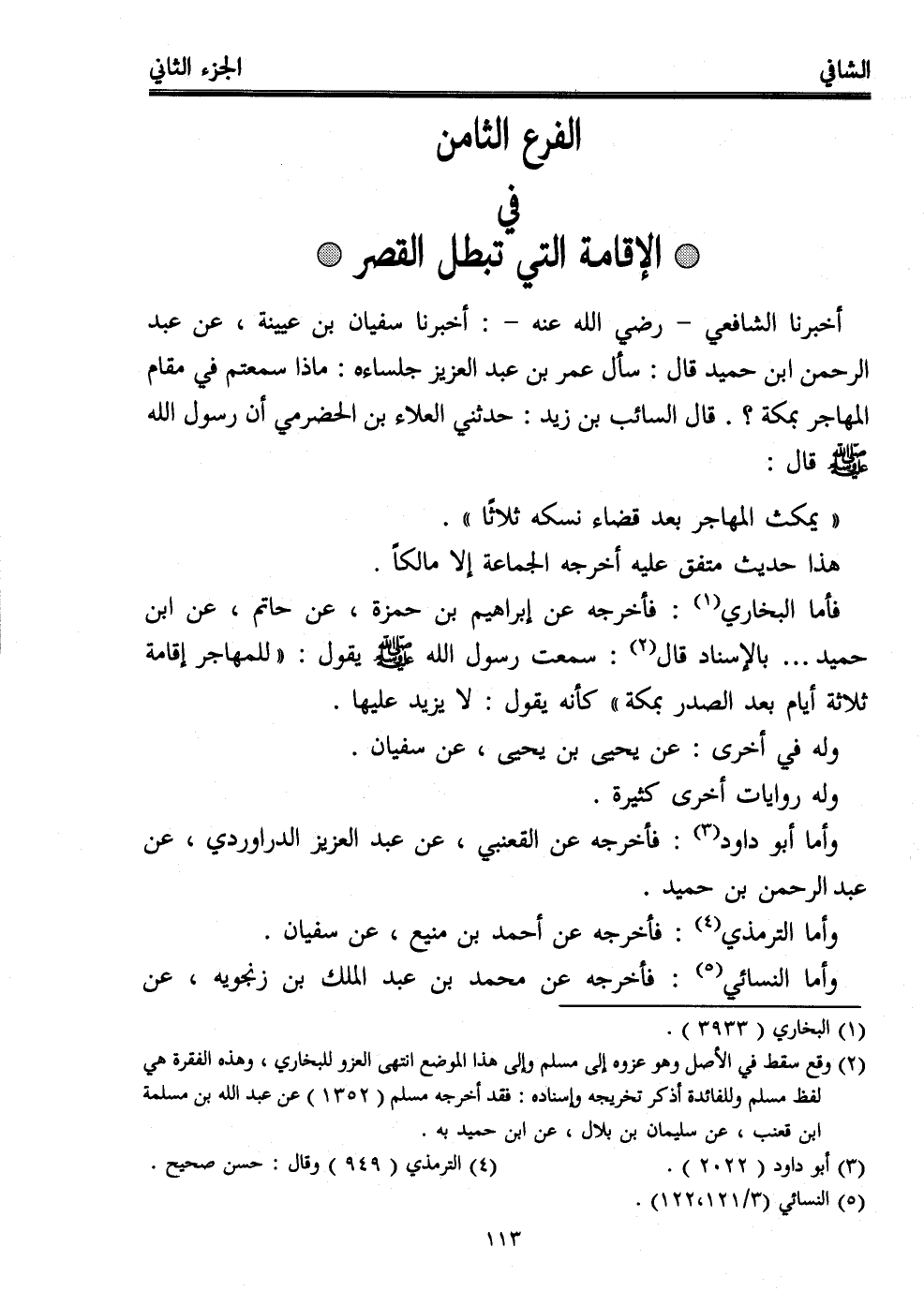 أخبرنا الشافعي -رضي الله عنه-: أخبرنا سفيان بن عيينة، عن عبد الرحمن ابن حميد قال: سأل عمر بن عبد العزيز جلساءه: ماذا سمعتم في مقام المهاجر بمكة؟. قال السائب بن زيد: حدثني العلاء بن الحضرمي أن رسول الله - صلى الله عليه وسلم - قال: