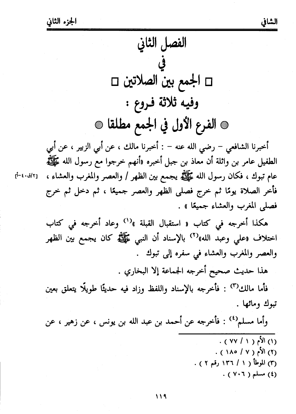 أخبرنا الشافعي -رضي الله عنه-: أخبرنا مالك، عن أبي الزبير، عن أبي الطفيل عامر بن واثلة أن معاذ بن جبل أخبره "أنهم خرجوا مع رسول الله - صلى الله عليه وسلم - عام تبوك، فكان رسول الله - صلى الله عليه وسلم - يجمع بين الظهر والعصر والمغرب والعشاء، فأخر الصلاة يومًا ثم خرج فصلى الظهر والعصر جميعًا، ثم دخل ثم خرج فصلى المغرب والعشاء جميعًا".