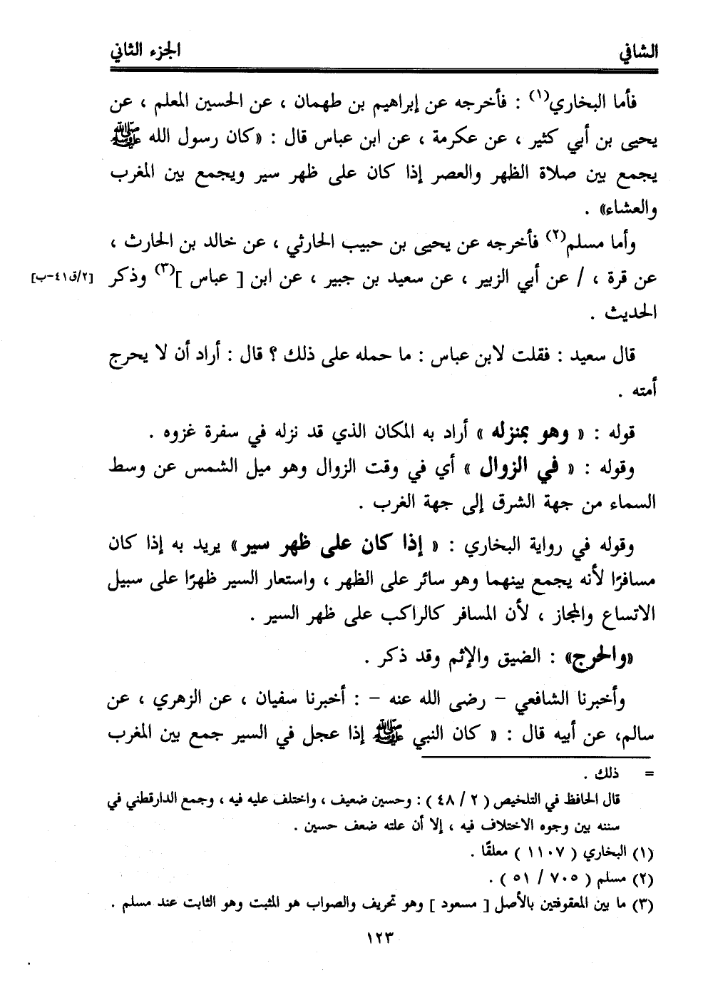 وأخبرنا الشافعي -رضي الله عنه-: أخبرنا سفيان، عن الزهري، عن سالم، عن أبيه قال: "كان النبي - صلى الله عليه وسلم - إذا عجل في السير جمع بين المغرب
