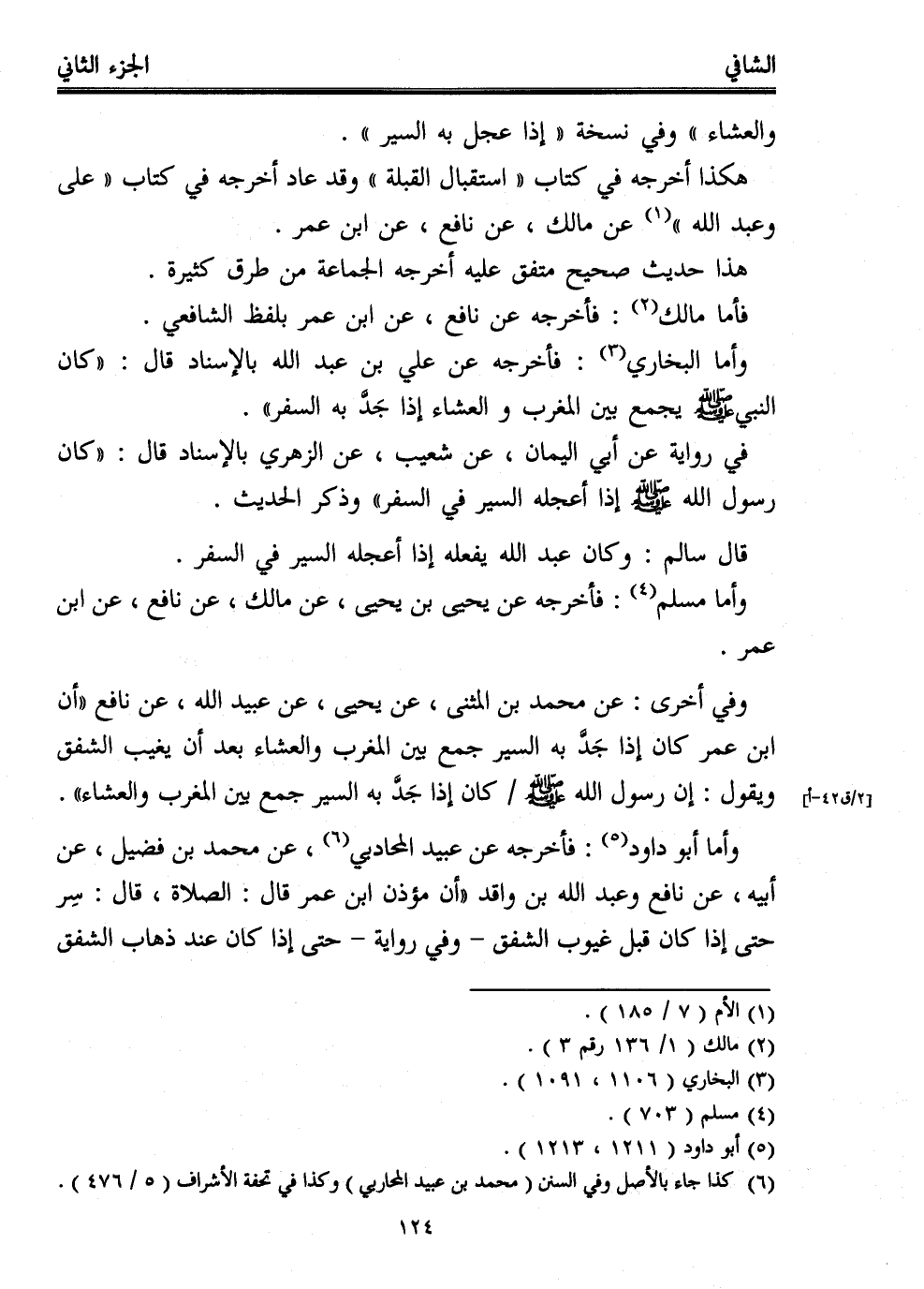 وفي أخرى: عن محمد بن المثنى، عن يحيى، عن عبيد الله، عن نافع "أن ابن عمر كان إذا جَدَّ به السير جمع بن المغرب والعشاء بعد أن يغيب الشفق ويقول: إن رسول الله - صلى الله عليه وسلم - كان إذا جَدَّ به السير جمع بين المغرب والعشاء".