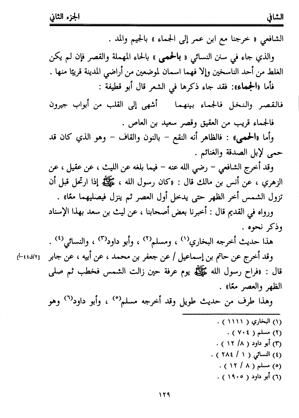 الشافعي "خرجنا مع ابن عمر إلى الجماء" بالجيم والمد.