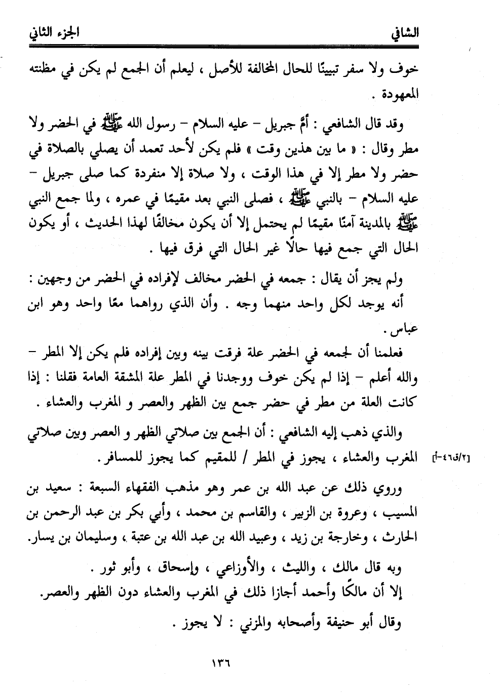 فعلمنا أن لجمعه في الحضر علة فرقت بينه وبين إفراده فلم يكن إلا المطر -والله أعلم- إذا لم يكن خوف ووجدنا في المطر علة المشقة العامة فقلنا: إذا كانت العلة من مطر في حضر جمع بين الظهر والعصر والمغرب والعشاء.
