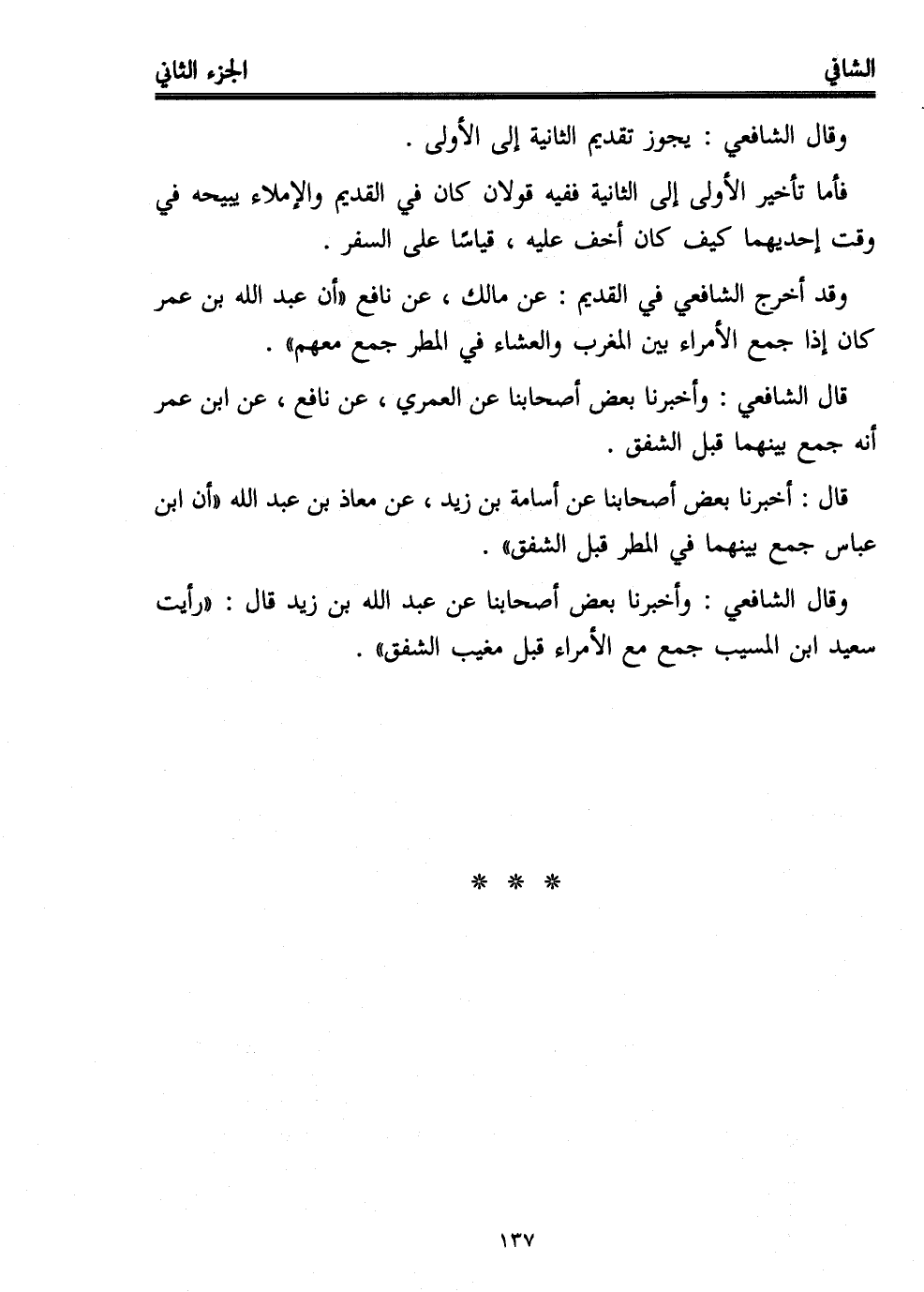 قال الشافعي: وأخبرنا بعض أصحابنا عن العمري، عن نافع، عن ابن عمر أنه جمع بينهما قبل الشفق.