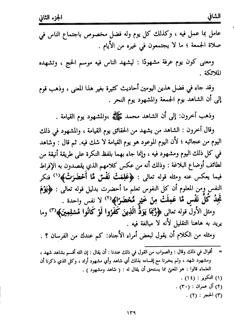 = أقوال في ذلك وقال: والصواب من القول في ذلك عندنا: أن يقال: ان الله أقسم بشاهد شهد، ومشهود شهد، ولم يخبرنا مع إقسامه بذلك أي شاهد وأي مشهود أراد، وكل الذي ذكرنا أن العلماء قالوا: هو المعنىّ مما يستحق أن يقال له: (شاهد ومشهود).