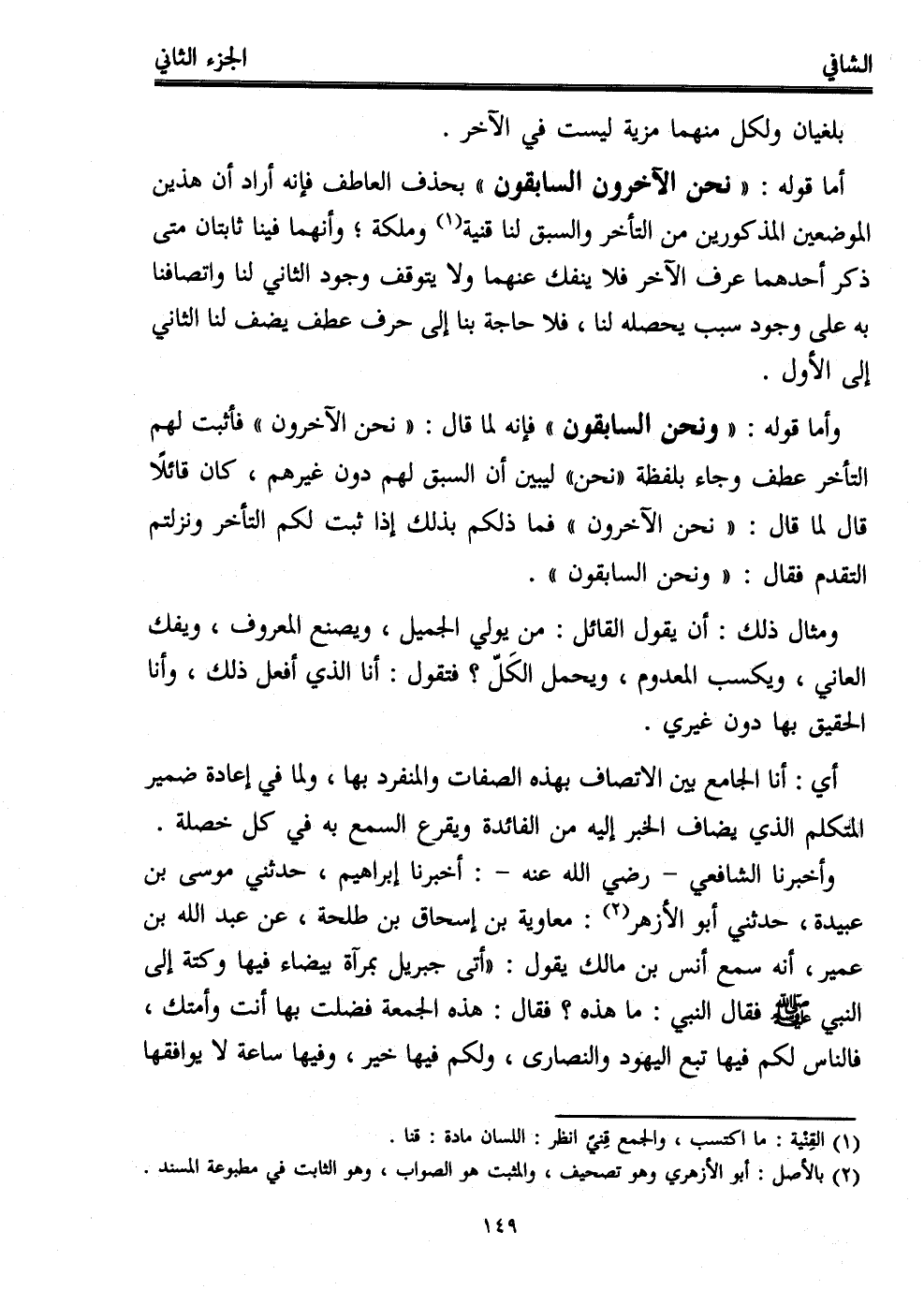 أما قوله: "نحن الآخرون السابقون" بحذف العاطف فإنه أراد أن هذين الموضعين المذكورين من التأخر والسبق لنا قنية (¬1) وملكة؛ وأنهما فينا ثابتان متى ذكر أحدهما عرف الآخر فلا ينفك عنهما ولا يتوقف وجود الثاني لنا واتصافنا به على وجود سبب يحصله لنا، فلا حاجة بنا إلى حرف عطف يضف لنا الثاني إلى الأول.