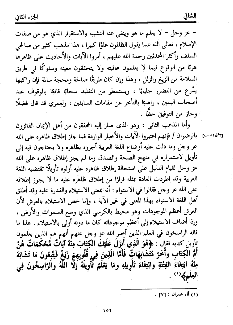 -عز وجل - لا يعلم ما هو وينفى عنه التشبيه والاستقرار الذي هو من صفات الإسلام، تعالى الله عما يقول الظالمون علوًّا كبيرا، هذا مذهب كثير من صالحي السلف وأكثر المحدثين رحمة الله عليهم، أمروا الآيات والأحاديث على ظاهرها هربًا من الوقوع فيما لا يعلمون عاقبته ولا يتحققون معيته وسلوكًا في طريق السلامة من الزيغ والزلل، وهذا وإن كان طريقًا صالحة ومحجة سالمة فإن راكبها يدَّرع من التضرر جلبابًا، ويستمطر من التقليد سحابًا قانعًا بالوقوف عند أصحاب اليمين، راضيًا بالتأخر عن مقامات السابقين، ولعمري قد قال فضلاً وحاز من التوفيق حظًّا.