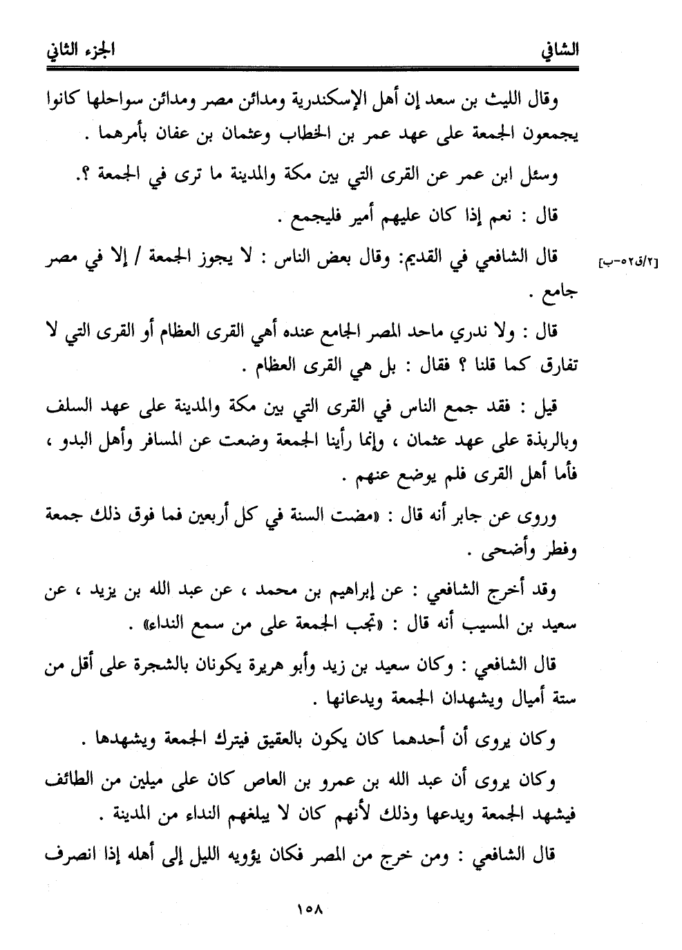 قال: ولا ندري ماحد المصر الجامع عنده أهل القرى العظام أو القرى التي لا تفارق كما قلنا؟ فقال: بل هي القرى العظام. قيل: فقد جمع الناس في القرى التي بين مكة والمدينة على عهد السلف وبالربذة على عهد عثمان، وإنما رأينا الجمعة وضعت عن المسافر وأهل البدو، فأما أهل القرى فلم يوضع عنهم.