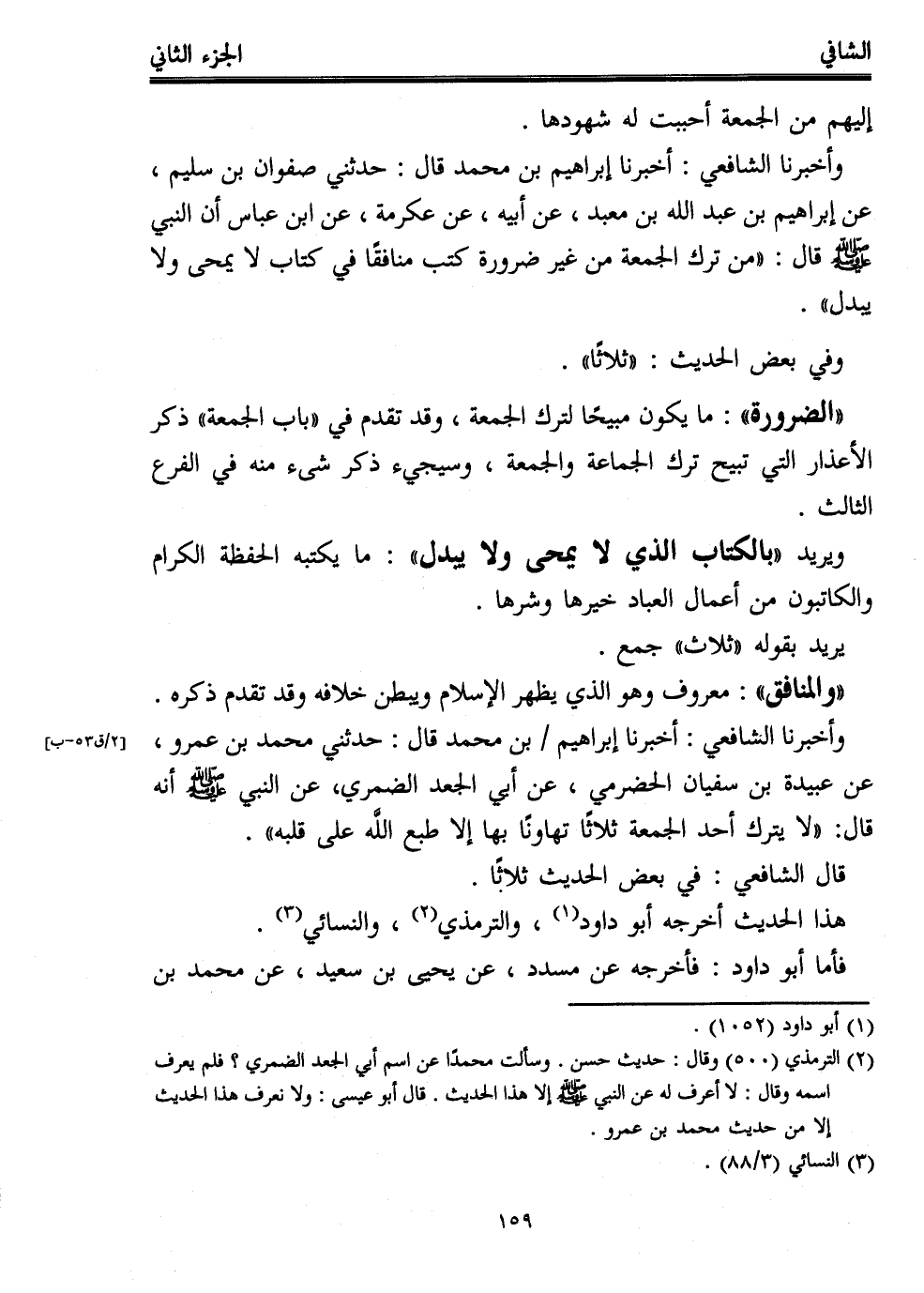 وأخبرنا الشافعي: أخبرنا إبراهيم بن محمد قال: حدثني صفوان بن سليم، عن إبراهيم بن عبد الله بن معبد، عن أبيه، عن عكرمة، عن ابن عباس أن النبي - صلى الله عليه وسلم - قال: "من ترك الجمعة من غير ضرورة كتب منافقًا في كتاب لا يمحى ولا يبدل".