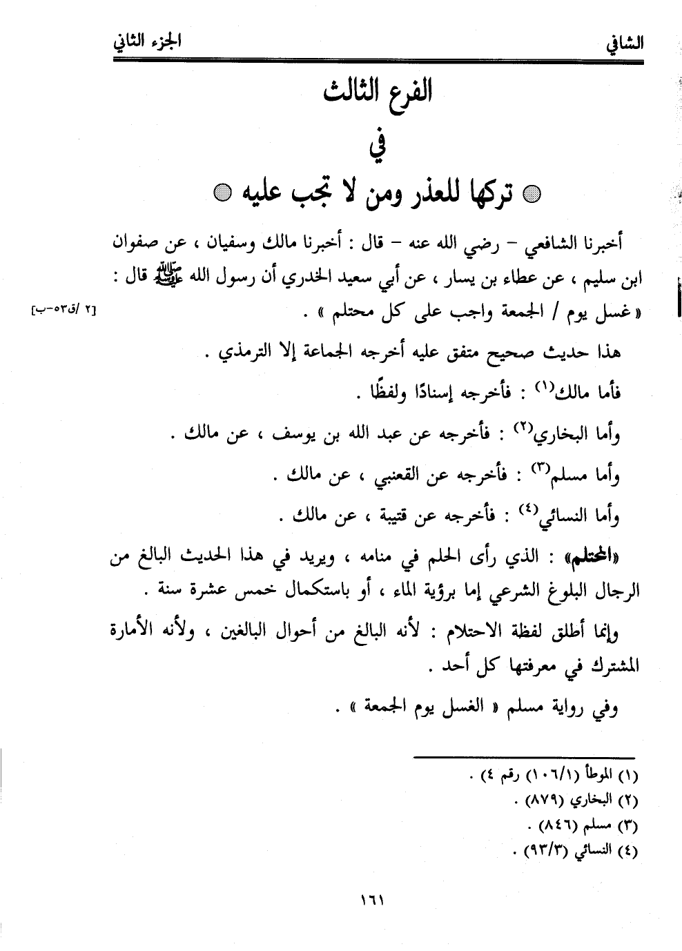 أخبرنا الشافعي -رضي الله عنه- قال: أخبرنا مالك وسفيان، عن صفوان ابن سليم، عن عطاء بن يسار، عن أبي سعيد الخدري أن رسول الله - صلى الله عليه وسلم - قال: "غسل يوم الجمعة واجب على كل محتلم".