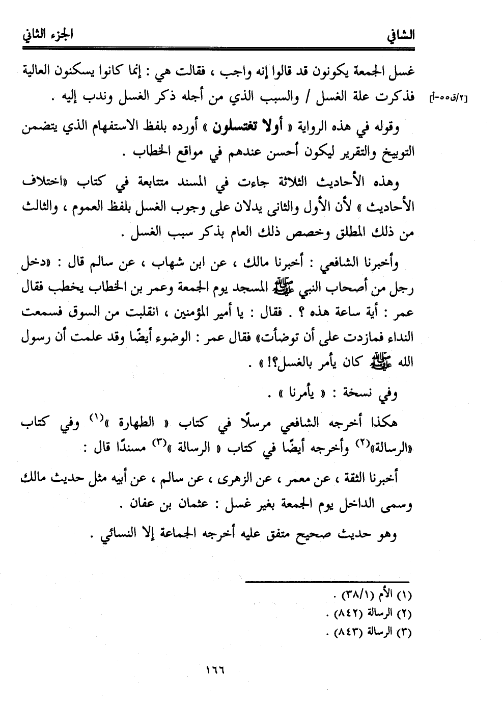 وأخبرنا الشافعي: أخبرنا مالك، عن ابن شهاب، عن سالم قال: "دخل رجل من أصحاب النبي - صلى الله عليه وسلم - المسجد يوم الجمعة وعمر بن الخطاب يخطب فقال عمر: آية ساعة هذه؟. فقال: يا أمير المؤمنين، انقلبت من السوق فسمعت النداء فمازدت على أن توضأت" فقال عمر: الوضوء أيضًا وقد علمت أن رسول الله - صلى الله عليه وسلم - كان يأمر بالغسل؟! ".
