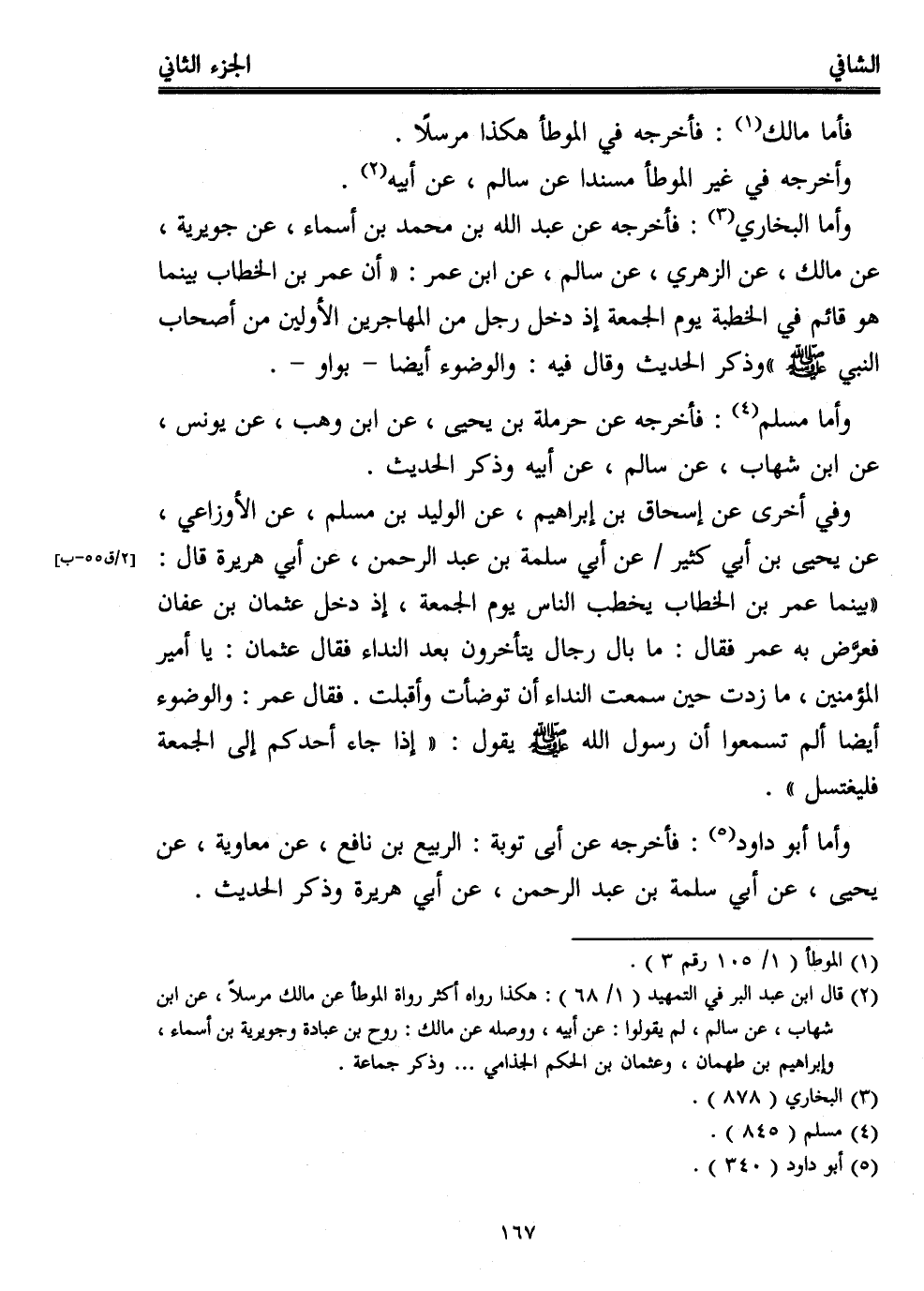 (¬2) قال ابن عبد البر في التمهيد (1/ 68): هكذا رواه أكثر رواة الموطأ عن مالك مرسلاً، عن ابن شهاب، عن سالم، لم يقولوا: عن أبيه، ووصله عن مالك: روح بن عبادة وجويرية بن أسماء، وإبراهيم بن طهمان، وعثمان بن الحكم الجذامي ... وذكر جماعة.