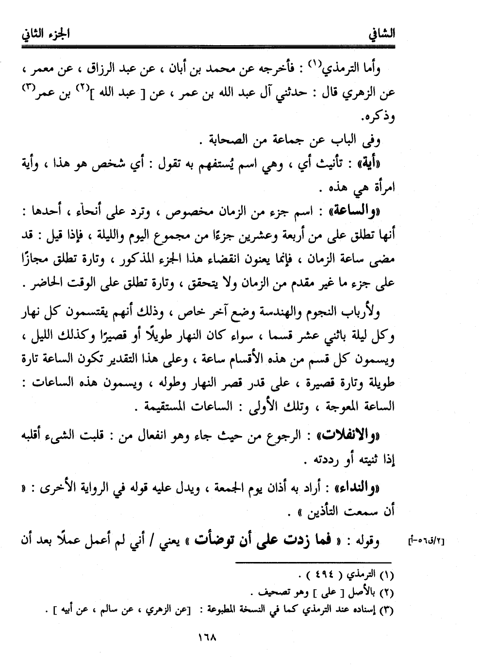 "والساعة": اسم جزء من الزمان مخصوص، وترد على أنحاء، أحدها: أنها تطلق على من أربعة وعشرين جزءًا من مجموع اليوم والليلة، فإذا قيل: قد مضى ساعة الزمان، فإنما يعنون انقضاء هذا الجزء المذكور، وتارة تطلق مجازًا على جزء ما غير مقدم من الزمان ولا يتحقق، وتارة تطلق على الوقت الحاضر.