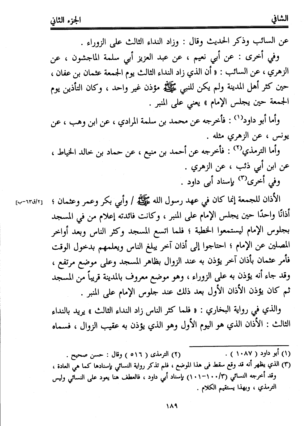 وفي أخرى: عن أبي نعيم، عن عبد العزيز أبي سلمة الماجشون، عن الزهري، عن السائب: "أن الذي زاد النداء الثالث يوم الجمعة عثمان بن عفان، حين كثر أهل المدينة ولم يكن للنبي - صلى الله عليه وسلم - مؤذن غير واحد، وكان التأذين يوم الجمعة حين يجلس الإمام" يعني على المنبر.