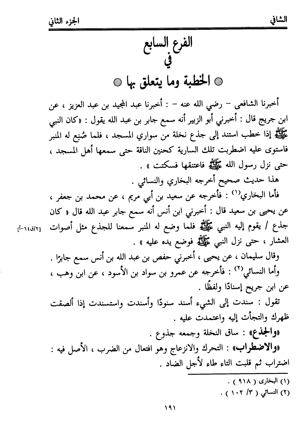 أخبرنا الشافعي -رضي الله عنه-: أخبرنا عبد المجيد بن عبد العزيز، عن ابن جريج قال: أخبرني أبو الزبير أنه سمع جابر بن عبد الله يقول: "كان النبي - صلى الله عليه وسلم - إذا خطب استند إلى جذع نخلة من سواري المسجد، فلما صُنِع له المنبر فاستوى عليه اضطربت تلك السارية كحنين الناقة حتى سمعها أهل المسجد، حتى نزل رسول الله - صلى الله عليه وسلم - فاعتنقها فسكتت".