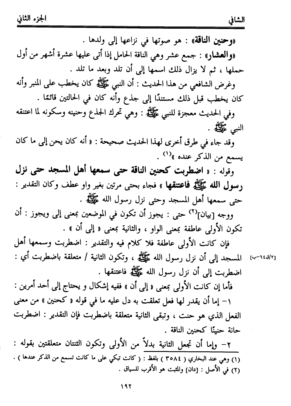 وقوله: "اضطربت كحنين الناقة حتى سمعها أهل المسجد حتى نزل رسول الله - صلى الله عليه وسلم - فاعتنقها" فجاء بحتى مرتين بغير واو عطف وكان التقدير: حتى سمعها أهل المسجد وحتى نزل رسول الله - صلى الله عليه وسلم -.