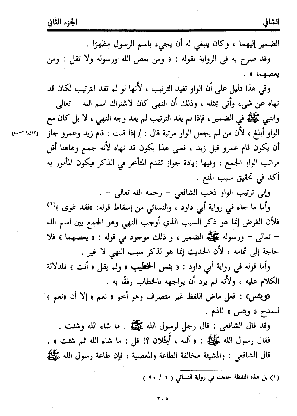 وفي هذا دليل على أن الواو تفيد الترتيب، لأنها لو لم تفد الترتيب لكان قد نهاه عن شيء وأتى بمثله، وذلك أن النهى كان لاشتراك اسم الله -تعالى- والنبي - صلى الله عليه وسلم - في الضمير، فإذا لم يفد الترتيب لم يفد وجه النهي، لا بل كان مع الواو أبلغة، لأن من لم يجعل الواو مرتبة قال: إذا قلت: قام زيد وعمرو جاز أن يكون قام عمرو قبل زيد، فعلى هذا يكون قد نهاه لأنه جمع وهاهنا أقل مراتب الواو الجمع، وفيها زيادة جواز تقدم المتأخر في الذكر فيكون المأمور به آكد في تحقيق سبب المنع.