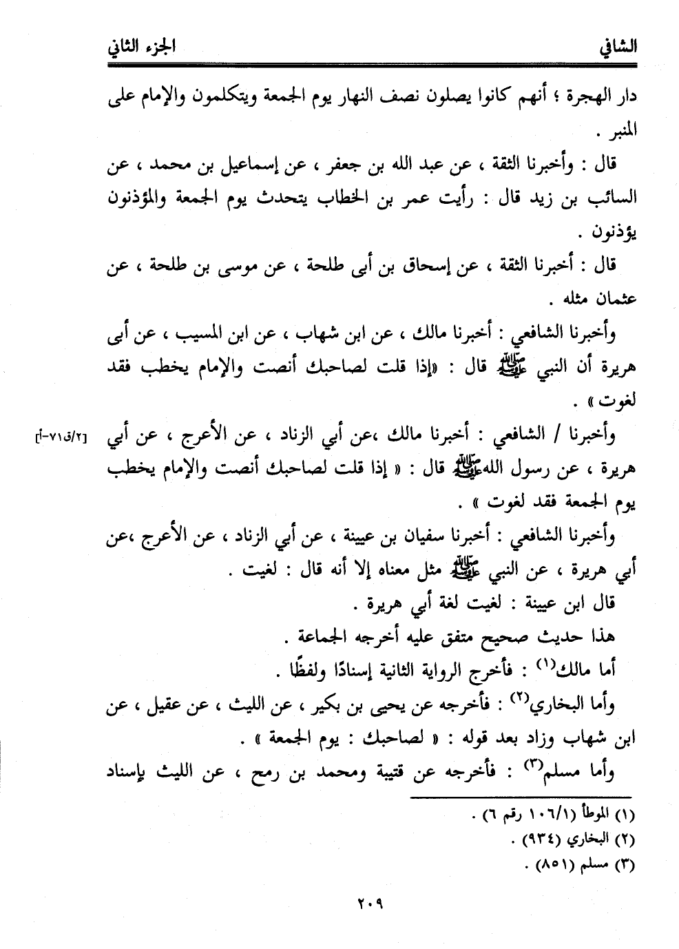 وأخبرنا الشافعي: أخبرنا مالك، عن أبي الزناد، عن الأعرج، عن أبي هريرة، عن رسول الله - صلى الله عليه وسلم - قال: "إذا قلت لصاحبك أنصت والإمام يخطب يوم الجمعة فقد لغوت".