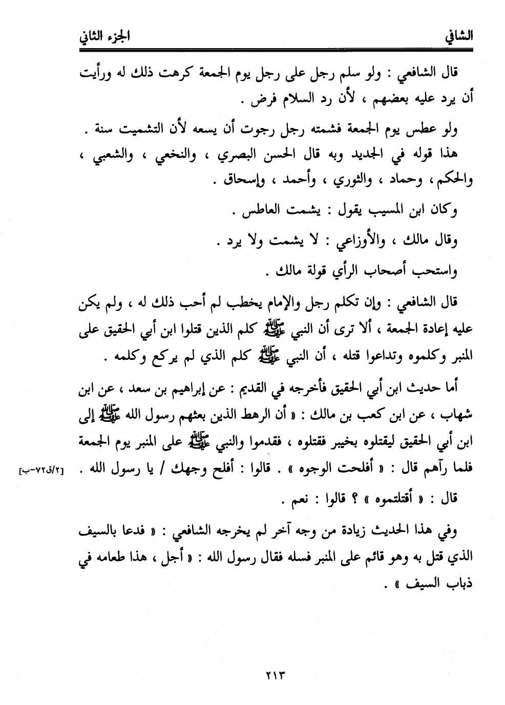 أما حديث ابن أبي الحقيق فأخرجه في القديم: عن إبراهيم بن سعد، عن ابن شهاب، عن ابن كعب بن مالك: "أن الرهط الذين بعثهم رسول الله - صلى الله عليه وسلم - إلى ابن أبي الحقيق ليقتلوه بخيبر فقتلوه، فقدموا والنبي - صلى الله عليه وسلم - على المنبر يوم الجمعة فلما رآهم قال: "أفلحت الوجوه". قالوا: أفلح وجهك يا رسول الله.