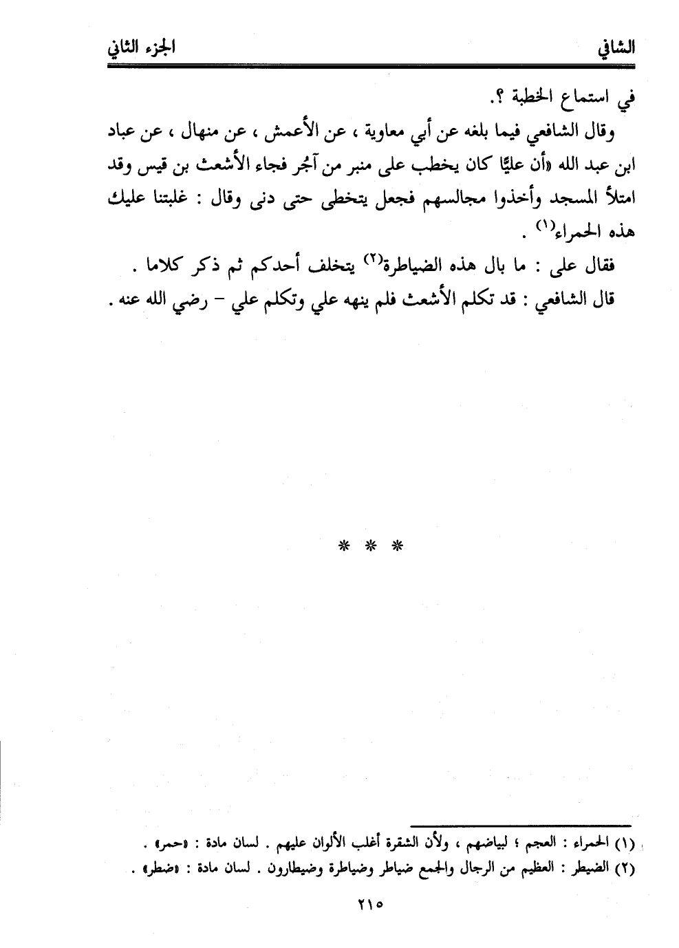 وقال الشافعي فيما بلغه عن أبي معاوية، عن الأعمش، عن منهال، عن عباد ابن عبد الله "أن عليًّا كان يخطب على منبر من آجُر فجاء الأشعث بن قيس وقد امتلأ المسجد وأخذوا مجالسهم فجعل يتخطى حتى دنى وقال: غلبتنا عليك هذه الحمراء (¬1).