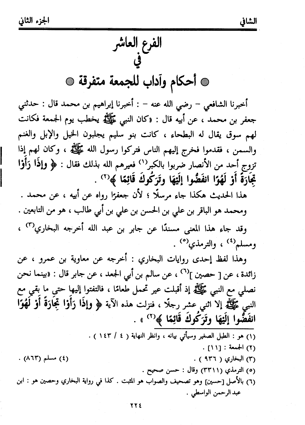 أخبرنا الشافعي -رضي الله عنه-: أخبرنا إبراهيم بن محمد قال: حدثني جعفر بن محمد، عن أبيه قال: "كان النبي - صلى الله عليه وسلم - يخطب يوم الجمعة فكانت لهم سوق يقال له البطحاء، كانت بنو سليم يجلبون الخيل والإبل والغنم والسمن، فقدموا فخرج إليهم الناس فتركوا رسول الله - صلى الله عليه وسلم -، وكان لهم إذا تزوج أحد من الأنصار ضربوا بالكبر (¬1) فعيرهم الله بذلك فقال: {وَإِذَا رَأَوْا تِجَارَةً أَوْ لَهْوًا انْفَضُّوا إِلَيْهَا وَتَرَكُوكَ قَائِمًا} (¬2).