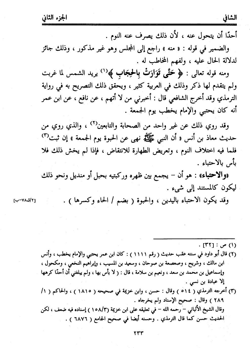 ومنه قوله تعالى: {حَتَّى تَوَارَتْ بِالْحِجَابِ} (¬1) يريد الشمس لما غربت ولم يتقدم لها ذكر وذلك في العربية كثير، ويحقق ذلك التصريح به في رواية الترمذي وقد أخرج الشافعي قال: أخبرني من لا أتهم، عن نافع، عن ابن عمر أنه كان يحتبي والإِمام يخطب يوم الجمعة.