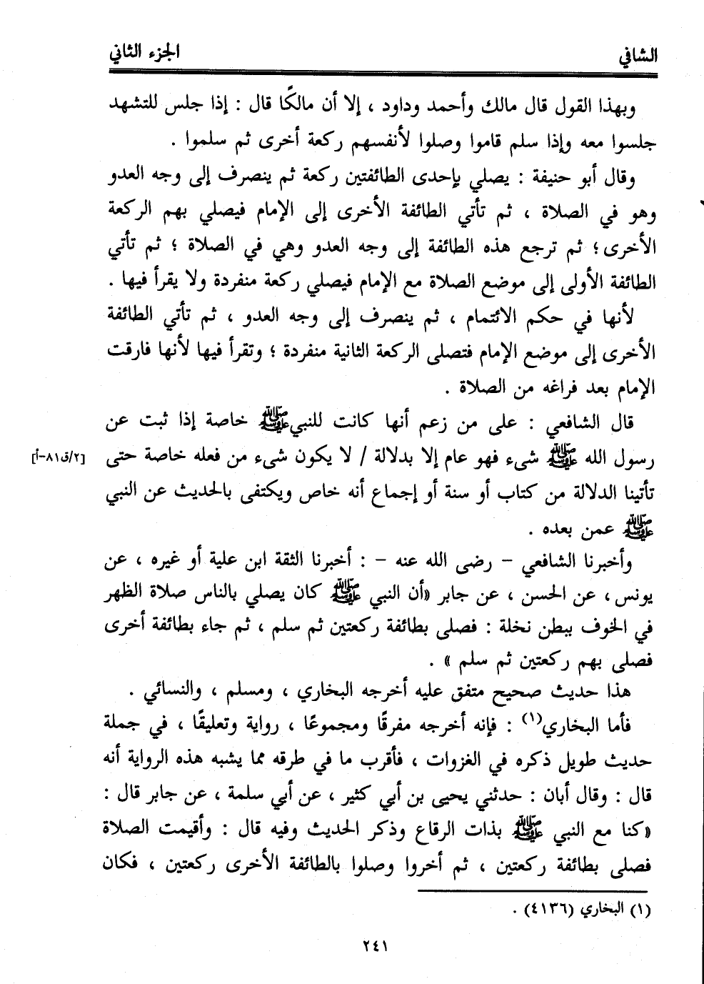 وأخبرنا الشافعي -رضي الله عنه-: أخبرنا الثقة ابن علية أو غيره، عن يونس، عن الحسن، عن جابر "أن النبي - صلى الله عليه وسلم - كان يصلي بالناس صلاة الظهر في الخوف ببطن نخلة: فصلى بطائفة ركعتين ثم سلم، ثم جاء بطائفة أخرى فصلى بهم ركعتين ثم سلم".