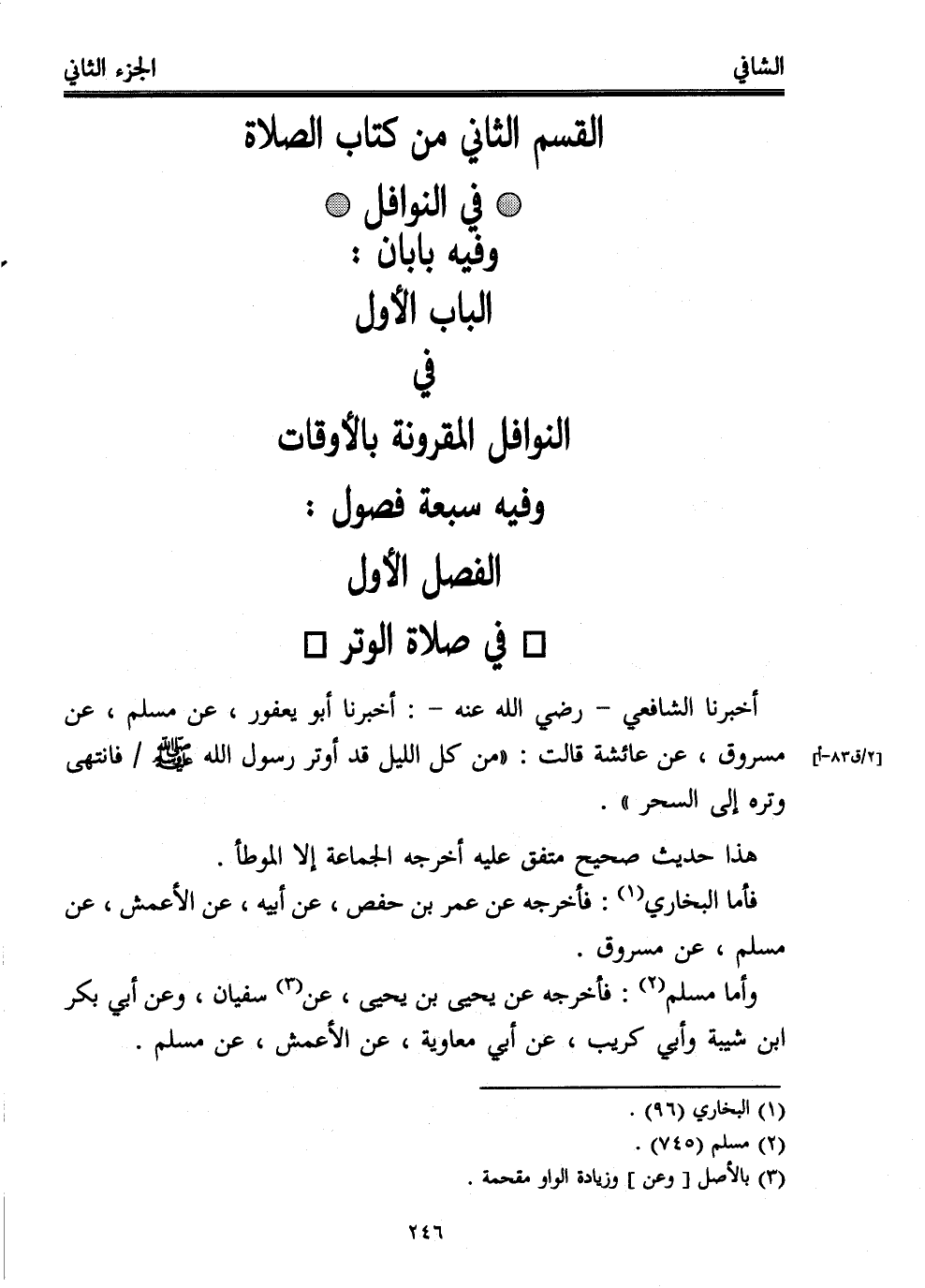 أخبرنا الشافعي -رضي الله عنه-: أخبرنا أبو يعفور، عن مسلم، عن مسروق، عن عائشة قالت: "من كل الليل قد أوتر رسول الله - صلى الله عليه وسلم - فانتهى وتره إلى السحر".