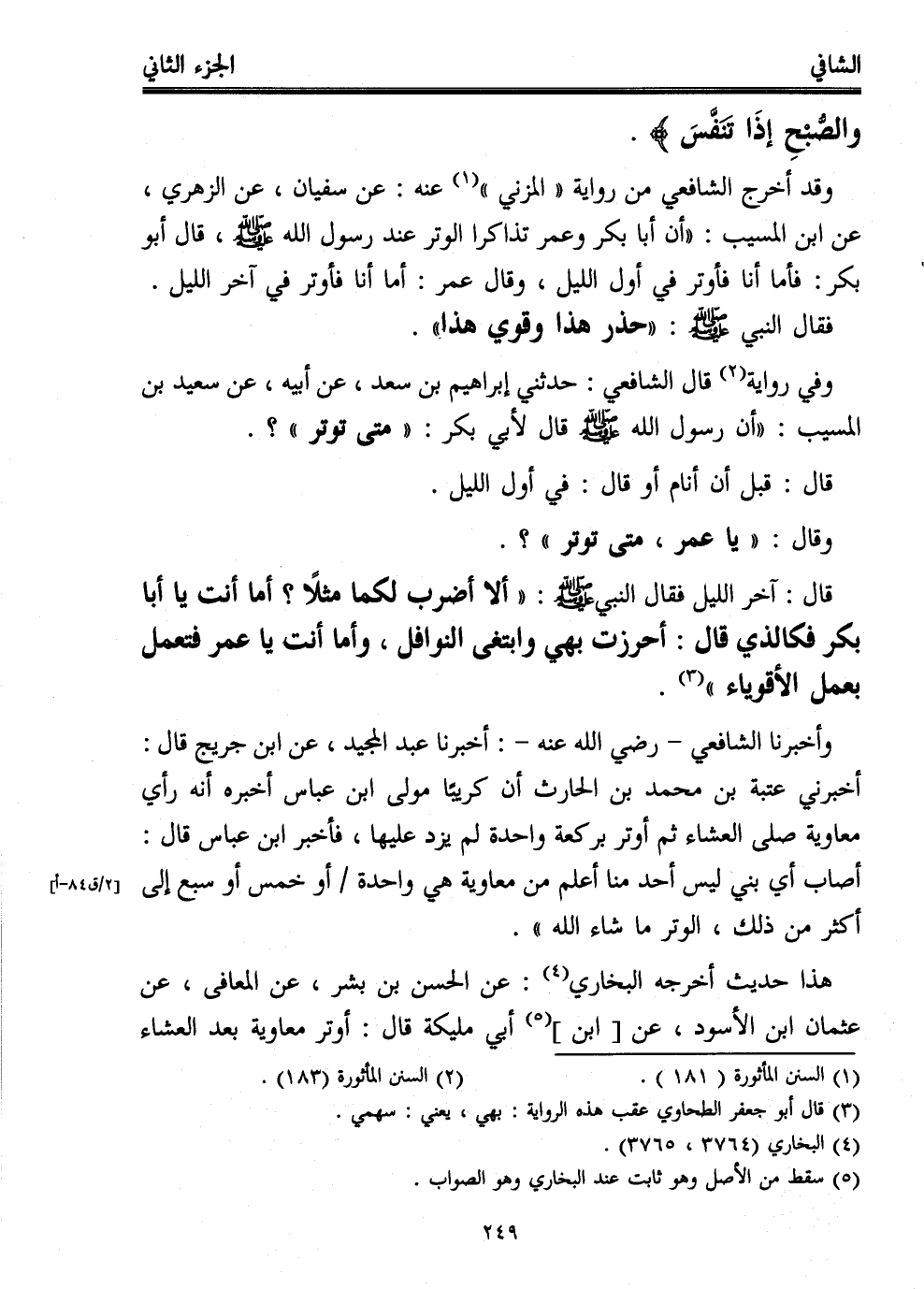 وفي رواية (¬2) قال الشافعي: حدثني إبراهيم بن سعد، عن أبيه، عن سعيد بن المسيب: "أن رسول الله - صلى الله عليه وسلم - قال لأبي بكر: "متى توتر"؟.
