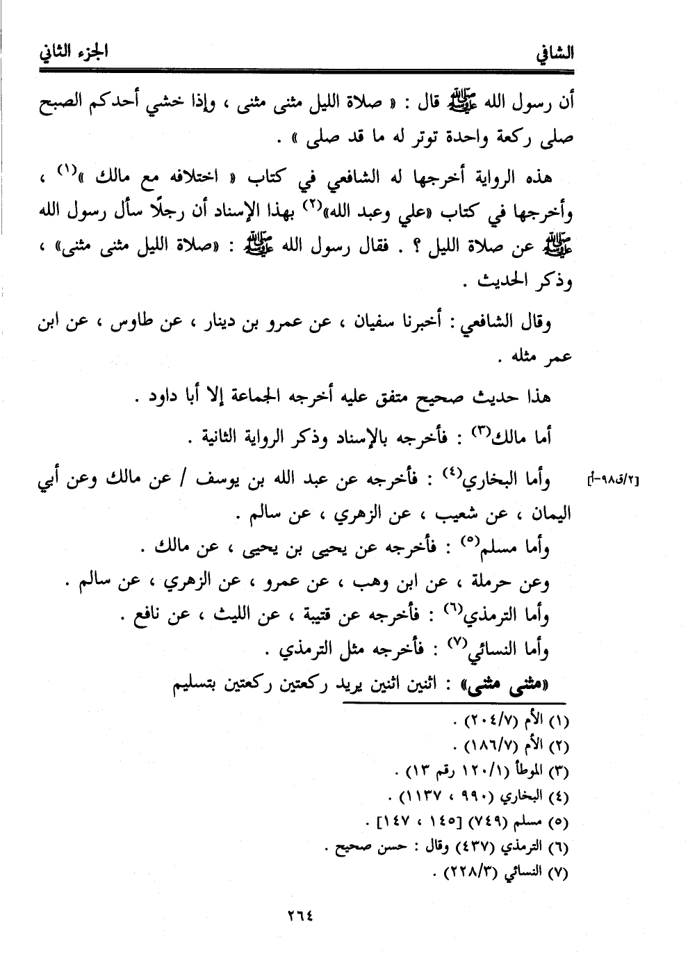 هذه الرواية أخرجها له الشافعي في كتاب "اختلافه مع مالك" (¬1)، وأخرجها في كتاب "علي وعبد الله" (¬2) بهذا الإسناد أن رجلاً سأل رسول الله - صلى الله عليه وسلم - عن صلاة الليل؟. فقال رسول الله - صلى الله عليه وسلم -: "صلاة الليل مثنى مثنى"، وذكر الحديث.