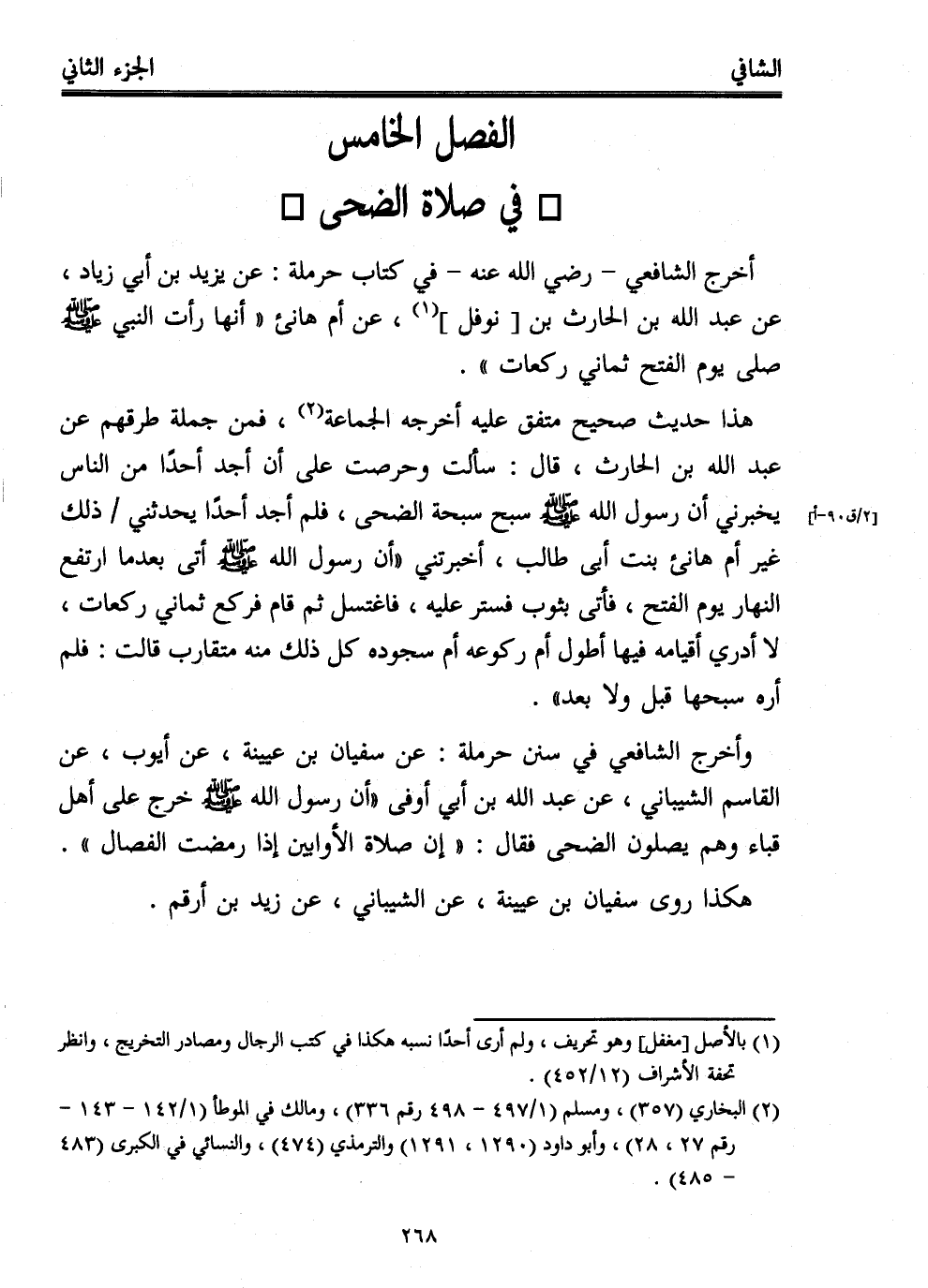 وأخرج الشافعي في سنن حرملة: عن سفيان بن عيينة، عن أيوب، عن القاسم الشيباني، عن عبد الله بن أبي أوفى "أن رسول الله - صلى الله عليه وسلم - خرج على أهل قباء وهم يصلون الضحى فقال: "إن صلاة الأوابين إذا رمضت الفصال".