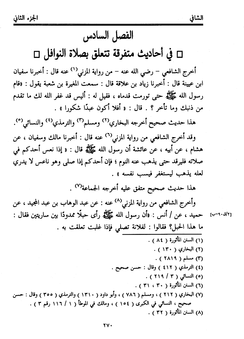 أخرج الشافعي -رضي الله عنه- من رواية المزني (¬1) عنه قال: أخبرنا سفيان ابن عيينة قال: أخبرنا زياد بن علاقة قال: سمعت المغيرة بن شعبة يقول: "قام رسول الله - صلى الله عليه وسلم - حتى تورمت قدماه، فقيل له: أليس قد غفر الله لك ما تقدم من ذنبك وما تأخر؟. قال: "أفلا أكون عبدًا شكورا".