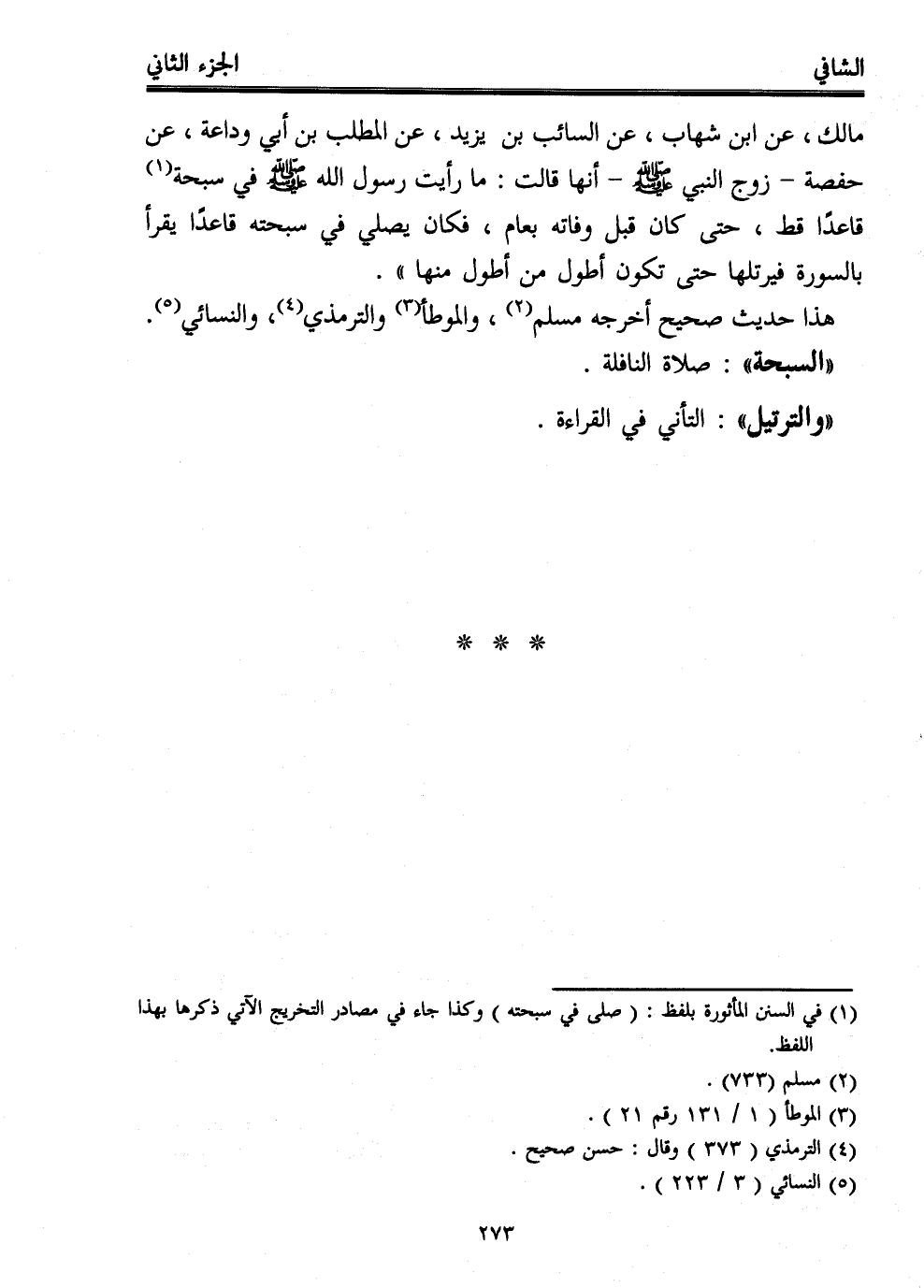 مالك، عن ابن شهاب، عن السائب بن يزيد، عن المطلب بن أبي وداعة، عن حفصة -زوج النبي - صلى الله عليه وسلم - أنها قالت: ما رأيت رسول الله - صلى الله عليه وسلم - في سبحة (¬1)