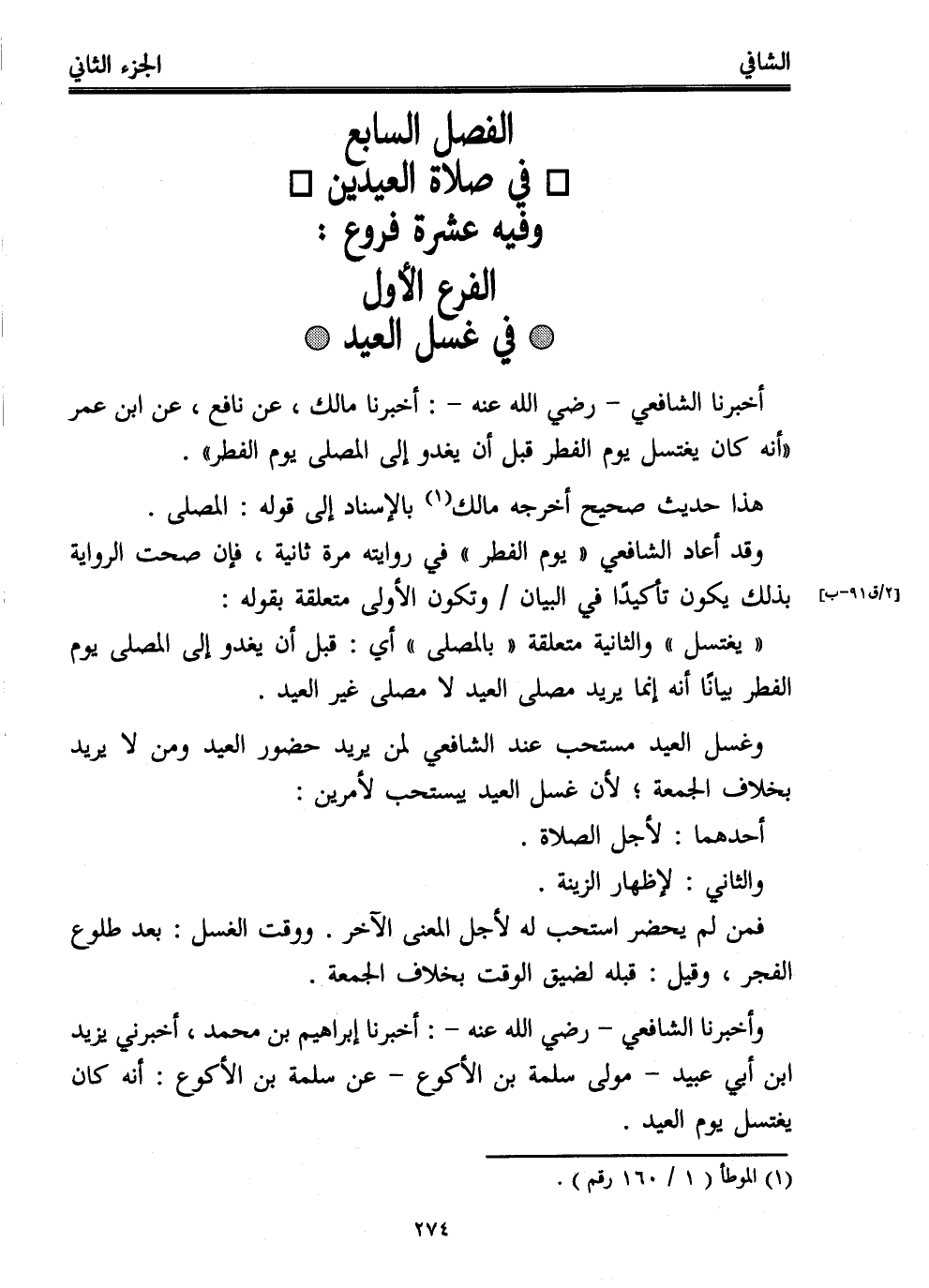أخبرنا الشافعي -رضي الله عنه-: أخبرنا مالك، عن نافع، عن ابن عمر "أنه كان يغتسل يوم الفطر قبل أن يغدو إلى المصلى يوم الفطر".