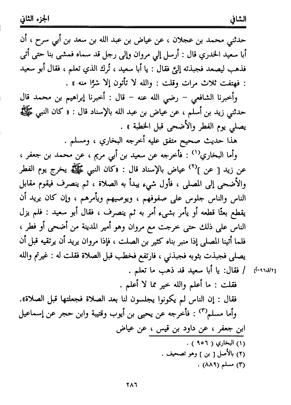 وأخبرنا الشافعي -رضي الله عنه- قال: أخبرنا إبراهيم بن محمد قال حدثني زيد بن أسلم، عن عياض بن عبد الله بالإسناد قال: "كان النبي - صلى الله عليه وسلم - يصلي يوم الفطر والأضحى قبل الخطبة".