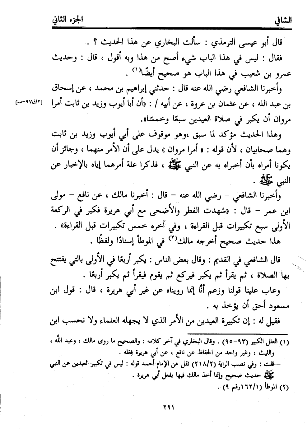 وأخبرنا الشافعي -رضي الله عنه- قال: حدثني إبراهيم بن محمد، عن إسحاق بن عبد الله، عن عثمان بن عروة، عن أبيه: "أن أبا أيوب وزيد بن ثابت أمرا مروان أن يكبر في صلاة العيدين سبعًا وخمسًا".
