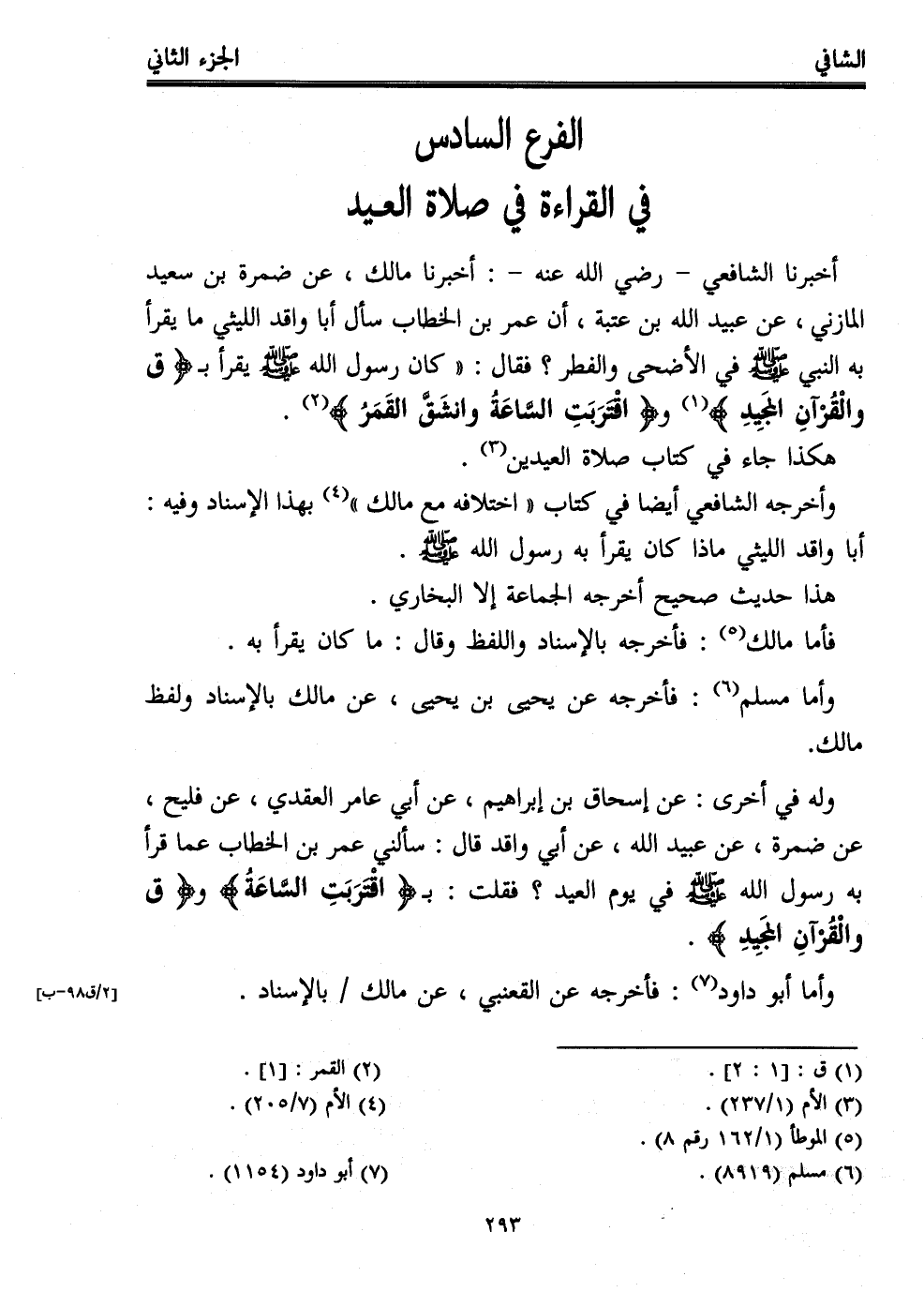 أخبرنا الشافعي -رضي الله عنه-: أخبرنا مالك، عن ضمرة بن سعيد المازني، عن عبيد الله بن عتبة، أن عمر بن الخطاب سأل أبا واقد الليثي ما يقرأ به النبي - صلى الله عليه وسلم - في الأضحى والفطر؟ فقال: "كان رسول الله - صلى الله عليه وسلم - يقرأ بـ {ق وَالْقُرْآنِ الْمَجِيدِ} (¬1) و {اقْتَرَبَتِ السَّاعَةُ وَانْشَقَّ الْقَمَرُ} (¬2).