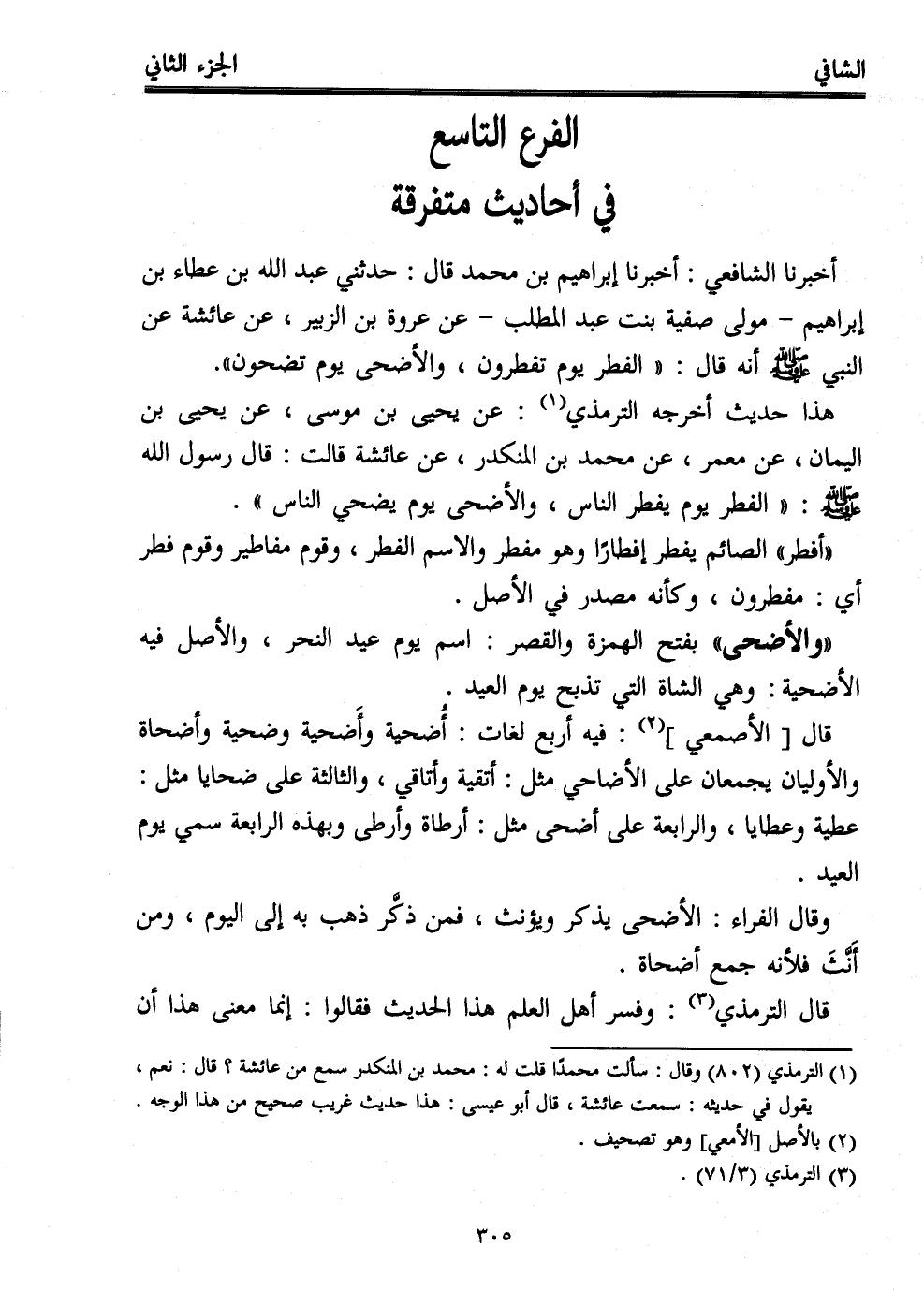 أخبرنا الشافعي: أخبرنا إبراهيم بن محمد قال: حدثني عبد الله بن عطاء بن إبراهيم -مولى صفية بنت عبد المطلب- عن عروة بن الزبير، عن عائشة عن النبي - صلى الله عليه وسلم - أنه قال: "الفطر يوم تفطرون، والأضحى يوم تضحون".