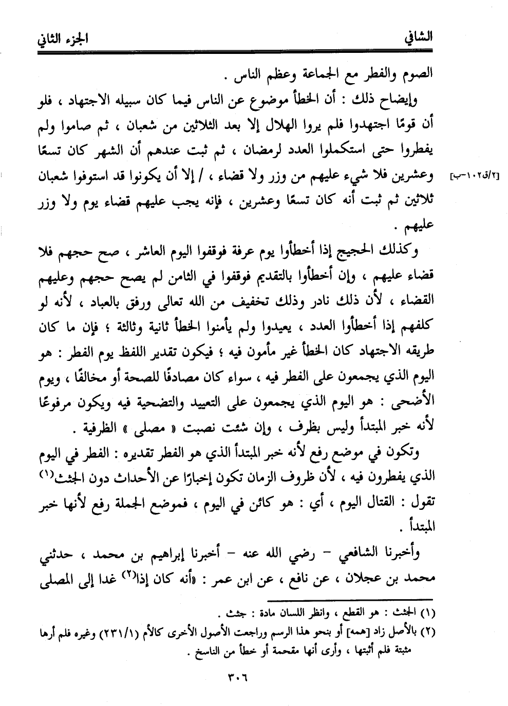 وإيضاح ذلك: أن الخطأ موضوع عن الناس فيما كان سبيله الاجتهاد، فلو أن قومًا اجتهدوا فلم يروا الهلال إلا بعد الثلاثين من شعبان، ثم صاموا ولم يفطروا حتى استكملوا العدد لرمضان، ثم ثبت عندهم أن الشهر كان تسعًا وعشرين فلا شيء عليهم من وزر ولا قضاء، إلا أن يكونوا قد استوفوا شعبان ثلاثين ثم ثبت أنه كان تسعًا وعشرين، فإنه يجب عليهم قضاء يوم ولا وزر عليهم.