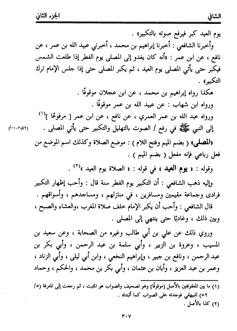 وأخبرنا الشافعي: أخبرنا إبراهيم بن محمد، أخبرني عبيد الله بن عمر، عن نافع، عن ابن عمر: "أنه كان يغدو إلى المصلى يوم الفطر إذا طلعت الشمس فيكبر حتى يأتي المصلى يوم العيد، ثم يكبر المصلى حتى إذا جلس الإِمام ترك التكبير".