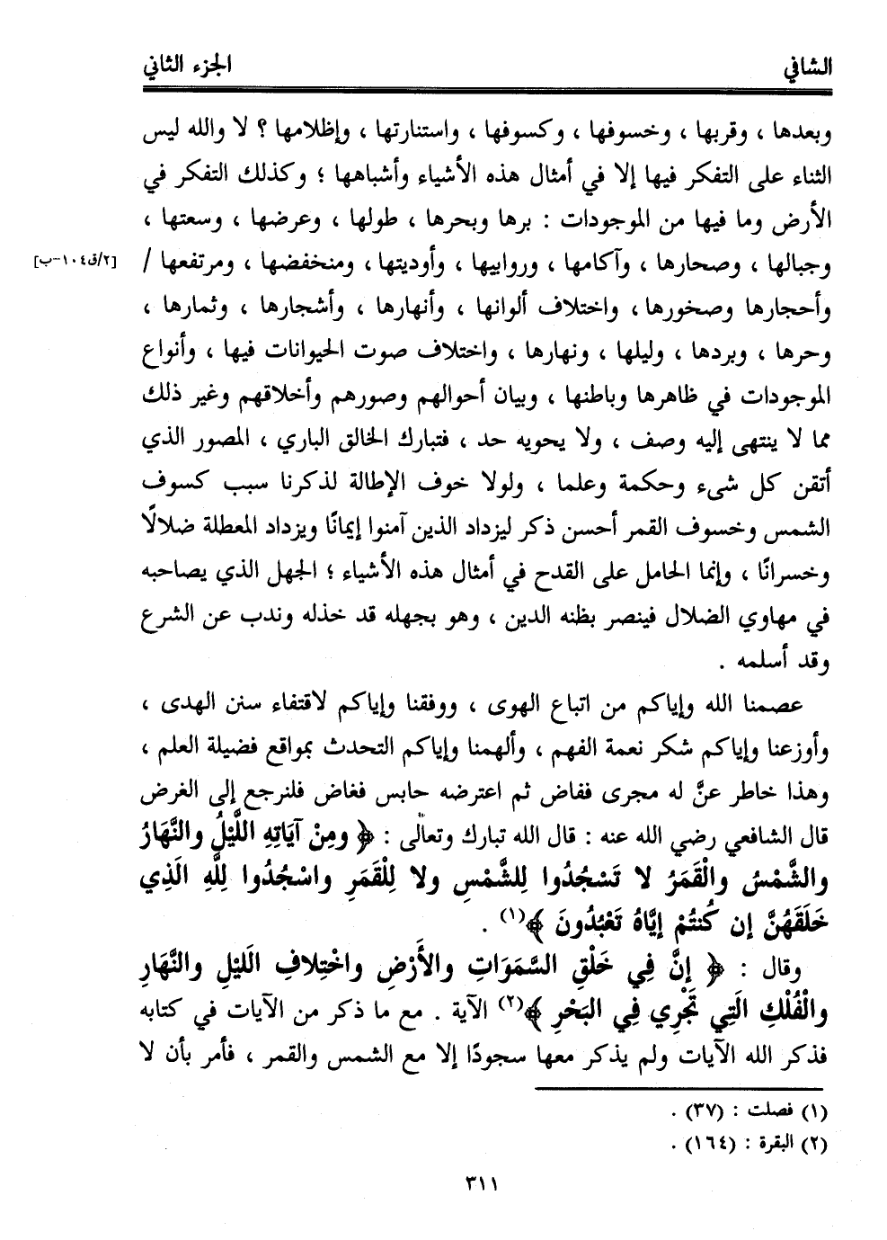 عصمنا الله وإياكم من اتباع الهوى، ووفقنا وإياكم لاقتفاء سنن الهدى، وأوزعنا وإياكم شكر نعمة اللهم، وألهمنا وإياكم التحدث بمواقع فضيلة العلم، وهذا خاطر عنَّ له مجرى ففاض ثم اعترضه حابس فغاض فلنرجع إلى الغرض قال الشافعي -رضي الله عنه-: قال الله تبارك وتعالى: {وَمِنْ آيَاتِهِ اللَّيْلُ وَالنَّهَارُ وَالشَّمْسُ وَالْقَمَرُ لَا تَسْجُدُوا لِلشَّمْسِ وَلَا لِلْقَمَرِ وَاسْجُدُوا لِلَّهِ الَّذِي خَلَقَهُنَّ إِنْ كُنْتُمْ إِيَّاهُ تَعْبُدُونَ} (¬1).