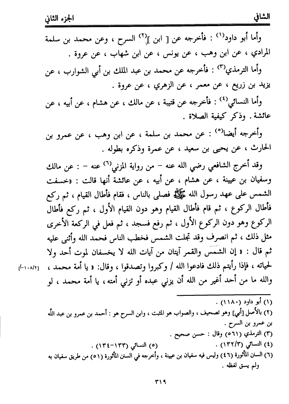 وقد أخرج الشافعي -رضي الله عنه- من رواية المزني (¬6) عنه-: عن مالك وسفيان بن عيينة، عن هشام، عن أبيه، عن عائشة أنها قالت: "خسفت الشمس على عهد رسول الله - صلى الله عليه وسلم - فصلى بالناس، فقام فأطال القيام، ثم ركع فأطال الركوع، ثم قام فأطال القيام وهو دون القيام الأول، ثم ركع فأطال الركوع وهو دون الركوع الأول، ثم رفع فسجد، ثم فعل في الركعة الأخرى مثل ذلك، ثم انصرف وقد تجلت الشمس فخطب الناس فحمد الله وأثنى عليه ثم قال: "إن الشمس والقمر آيتان من آيات الله لا يخسفان لموت أحد ولا لحياته، فإذا رأيتم ذلك فادعوا الله وكبروا وتصدقوا، وقال: "يا أمة محمد، والله ما من أحد أغير من الله أن يزني عبده أو تزني أمته، يا أمة محمد، لو