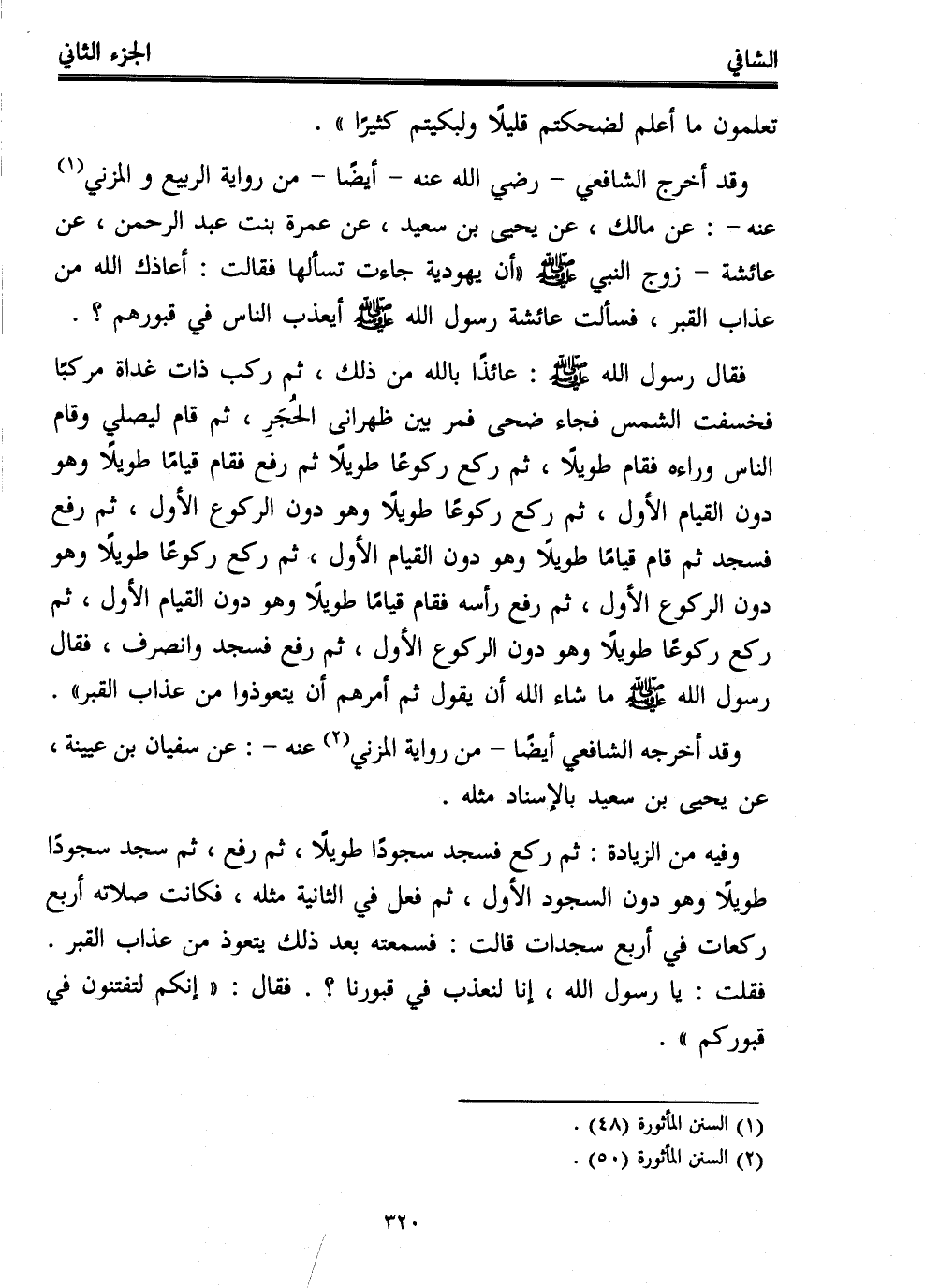 فقال رسول الله - صلى الله عليه وسلم -: عائذًا بالله من ذلك، ثم ركب ذات غداة مركبًا فخسفت الشمس فجاء ضحى فمر بين ظهرانى الحُجَرِ، ثم قام ليصلي وقام الناس وراءه فقام طويلاً، ثم ركع ركوعًا طويلاً ثم رفع فقام قيامًا طويلاً وهو دون القيام الأول، ثم ركع ركوعًا طويلاً وهو دون الركوع الأول، ثم رفع فسجد ثم قام قيامًا طويلاً وهو دون القيام الأول، ثم ركع ركوعًا طويلاً وهو دون الركوع الأول، ثم رفع رأسه فقام قيامًا طويلاً وهو دون القيام الأول، ثم ركع ركوعًا طويلاً وهو دون الركوع الأول، ثم رفع فسجد وانصرف، فقال رسول الله - صلى الله عليه وسلم - ما شاء الله أن يقول ثم أمرهم أن يتعوذوا من عذاب القبر".